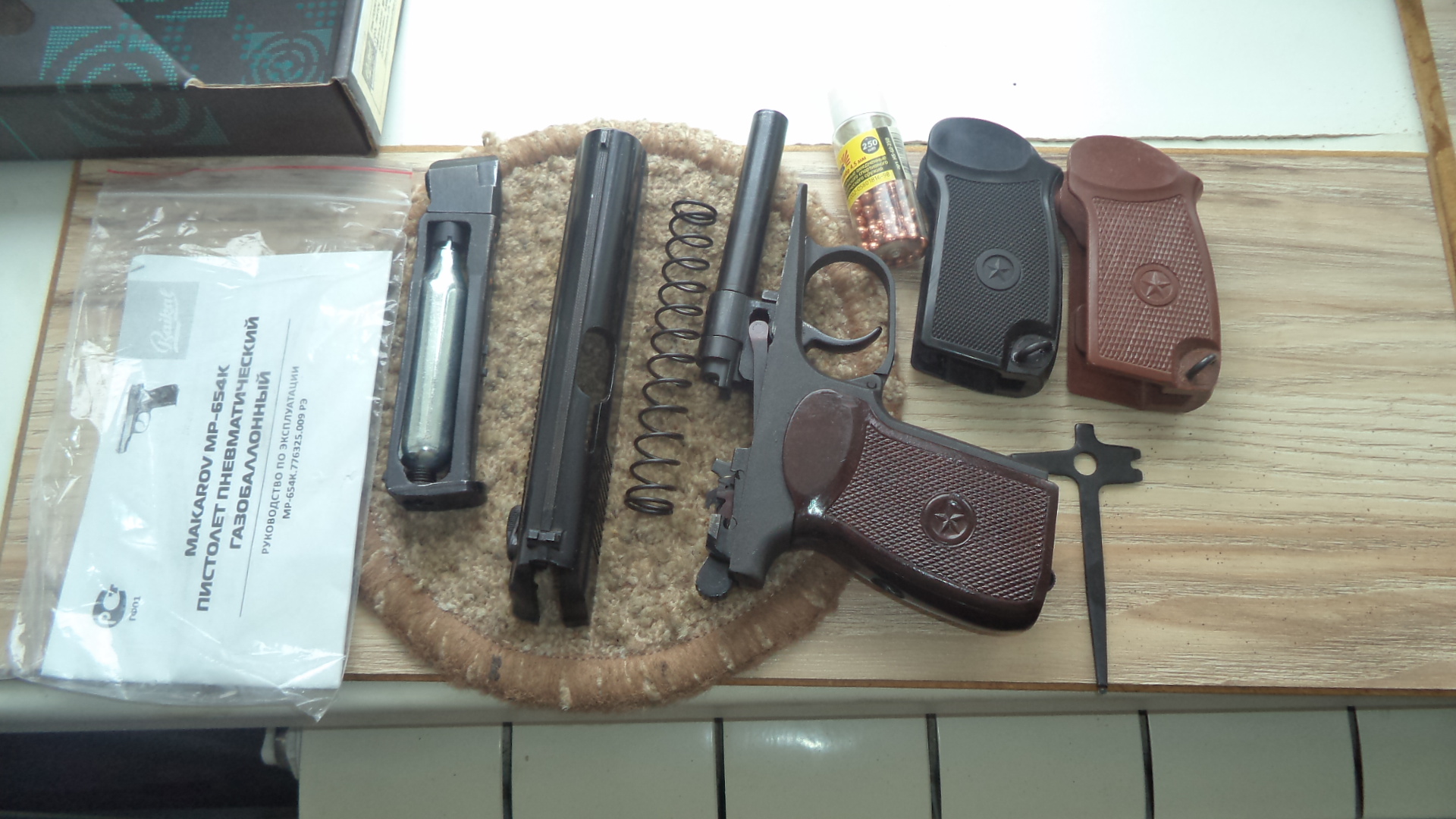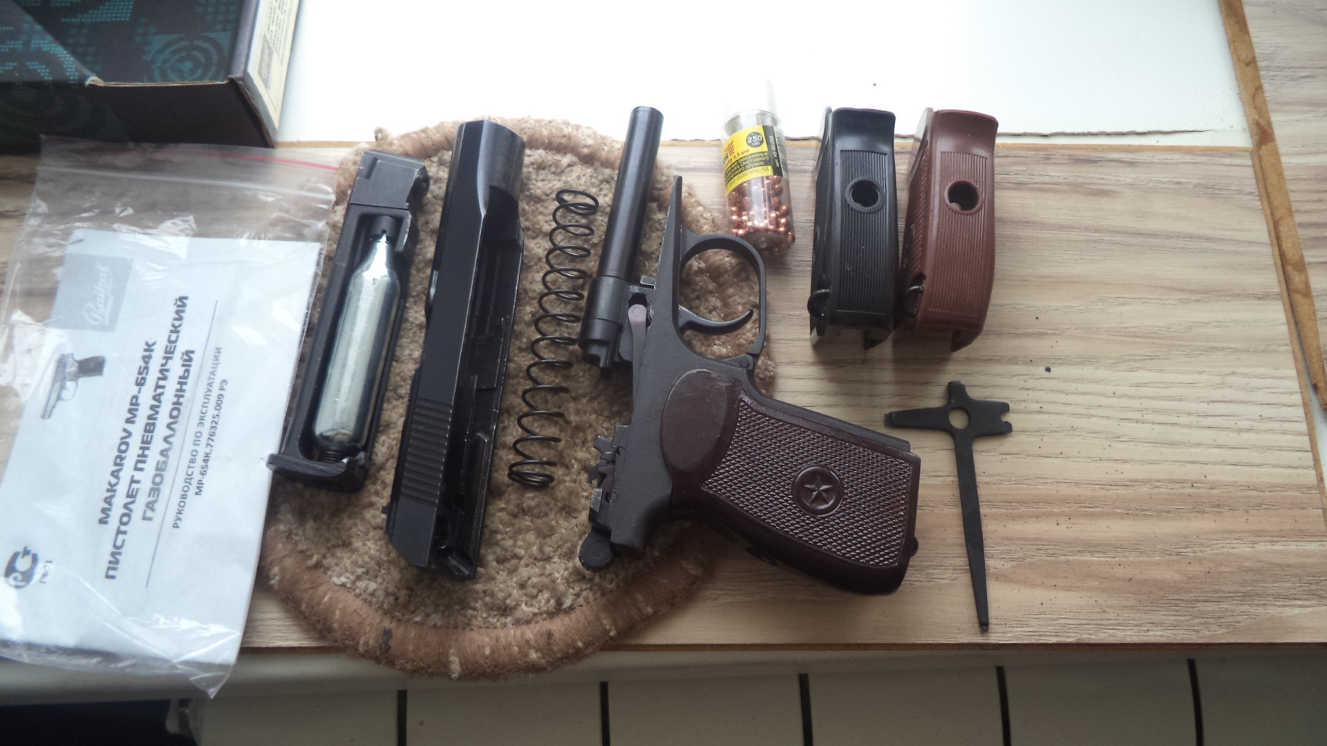 МР654К32. 420р. Установлена бакелитовая рукоятка. В комплекте две пластиковые рукоятки разных цветов. Остальное в стоке с завода. Есть паз под выбрасыватель. Состояние нового. В комплекте коробка, ключ, документы , инструкция , шарики ,баллон , пистолет. Вопросы по номеру 80336863322. Вайбер. Почта.