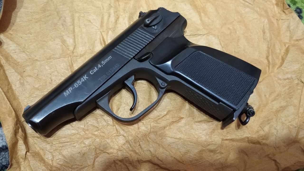 МР654к в отличном состоянии! Изготовлен на базе пистолета Макарова, целиком из стали. Абсолютно исправен. В комплекте баллончик и шарики, документы, коробка, резинки. 300р.
