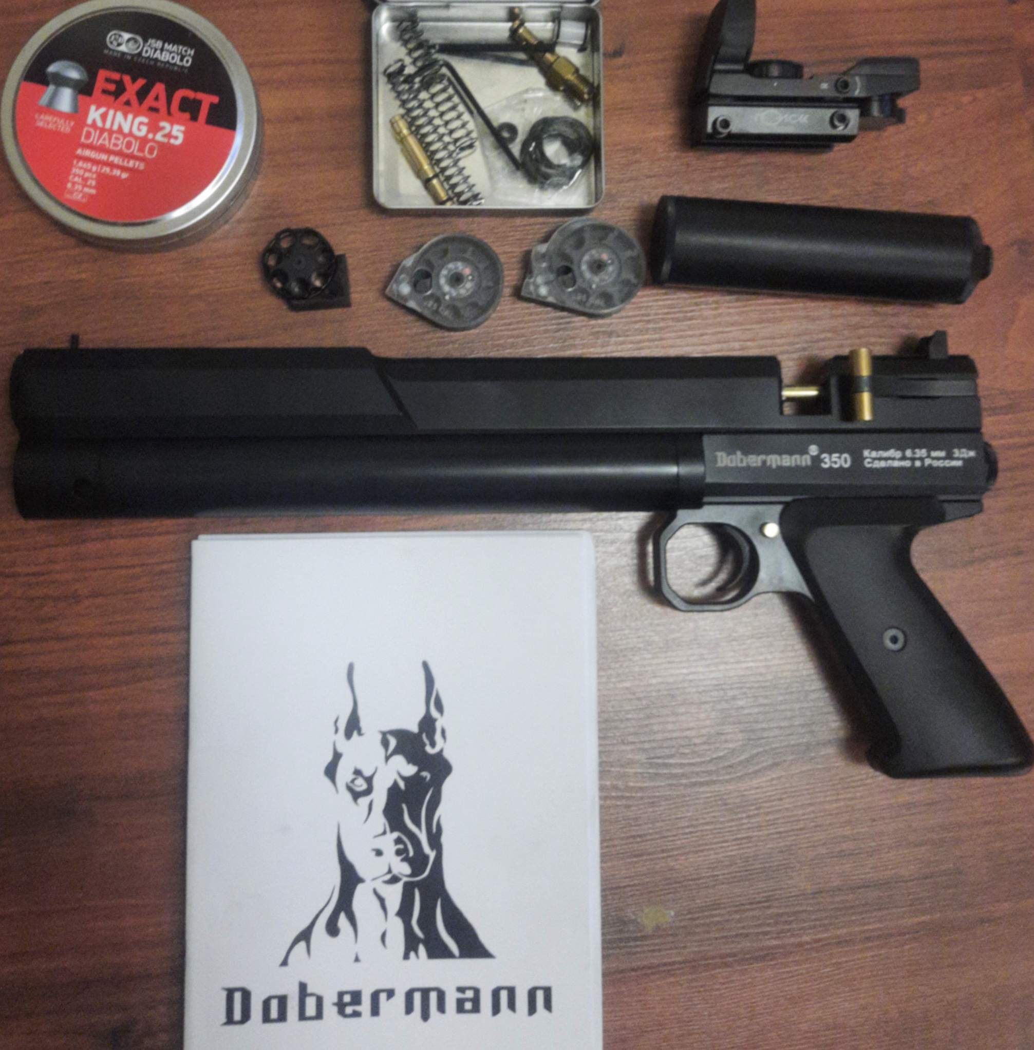 Продам добермана, калибр 6,35, заказывал у Константина, получил ноябрь 2022, ствол 190 мм, + усиленная пружина,калиматор, три барабана,переходник под приклад,пули, продаётся в 3 дж, 1850 рублей, Минск, 80293377003