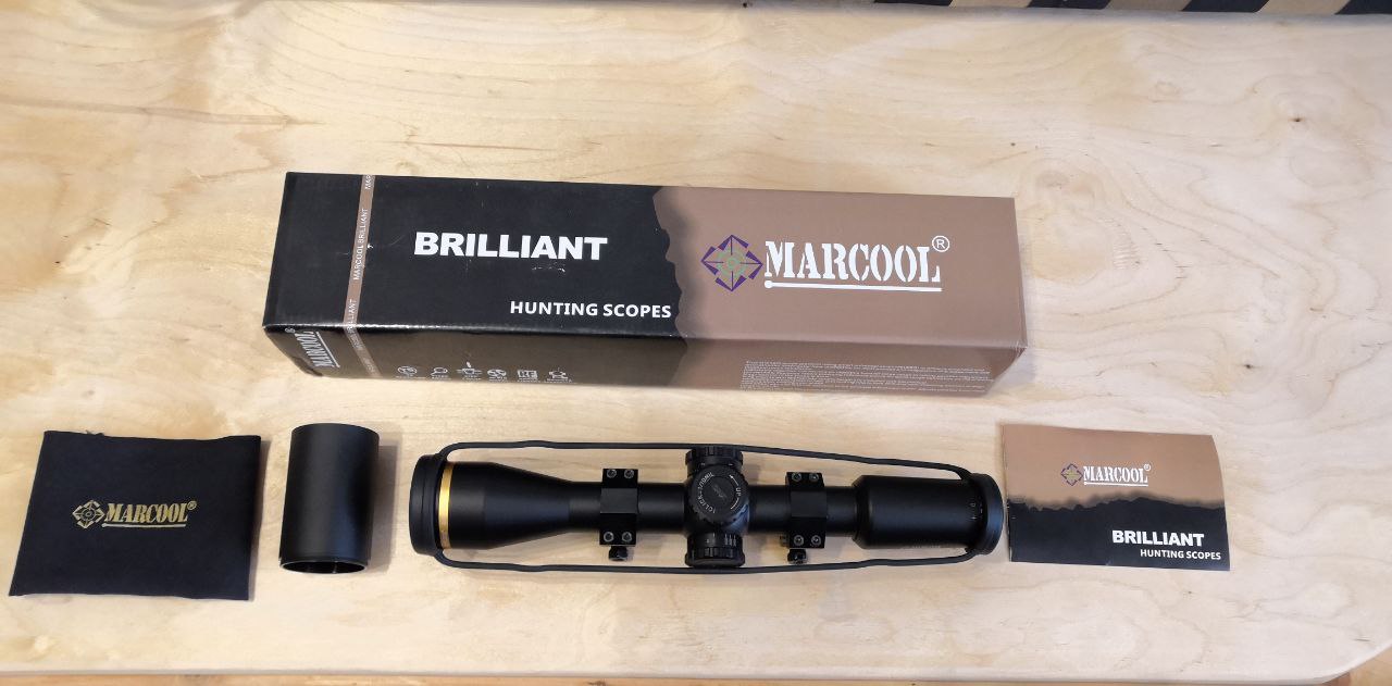 Комплект:прицел, кольца 30 средние, уровень пузырьковый,бленда, салфетка,бумажки, коробка.