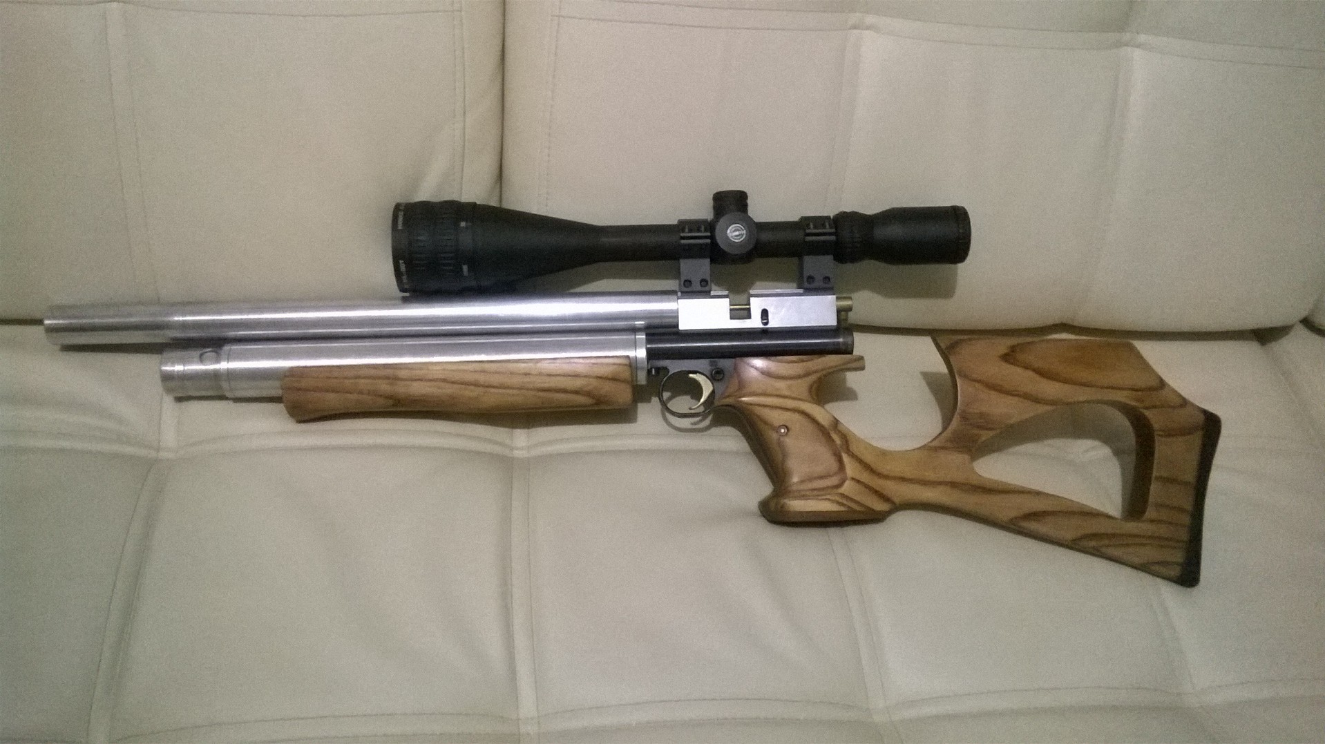Продам многозарядный карабин калибра 4.5(производство MADE in UKRAINE) на основе Crosman 1377 (кусок трубы ударника и спуск ). Спуск мягкий,легкий, модер глушит хорошо.Ствол 35см латунный, точный. Длина всего карабина - 80см, длина железа - 55см., резервуар объем 160 кубиков 260 м/с пулькой 0,67г, скорость регулируется винтом. С заправки около 60 пуков. Комплект: Карабин, штуцер, "марадеромагазин" на 14 пуль(подгулявший), прицел HAWKE 6-24x50 комплект - 380$. Без прицела 300$. Прицел установлен ровно, на фото как то получилось что криво.