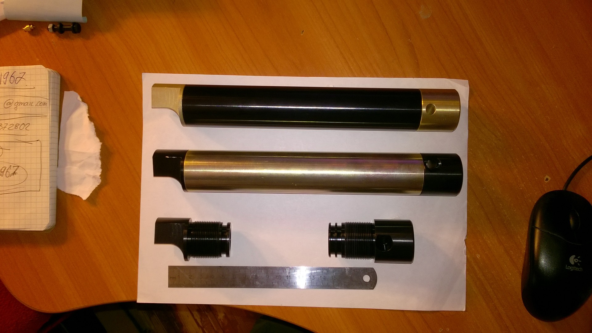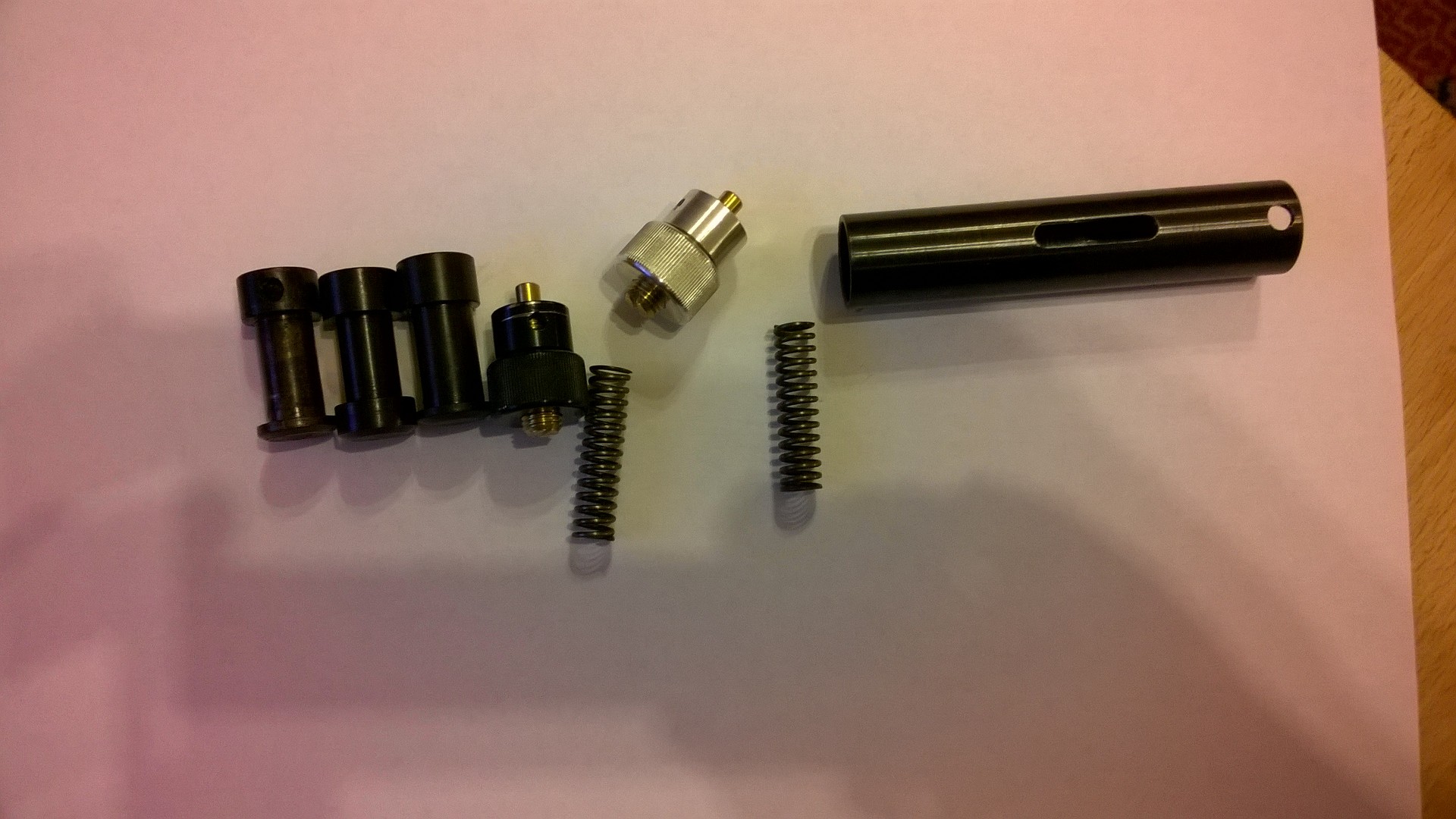 длинна 26 см. резик диаметр 40 мм. толщина стенки 5 мм. апрессован на 450 атм. труба 88 из цельного прута с проточками. три ударника на выбор. пружина. поджим пружины. заводское оксидирование и анодирование. как то так. всего 2 штуки. :-)