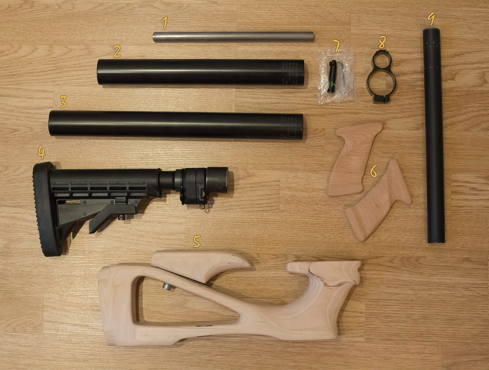 4. Складной приклад для 1377, м4 типа с переходником на заднюю пробку поджима крюгера. (нужно выточить втулку и задать подходящей гайкой.)----------------- 350 тыс.