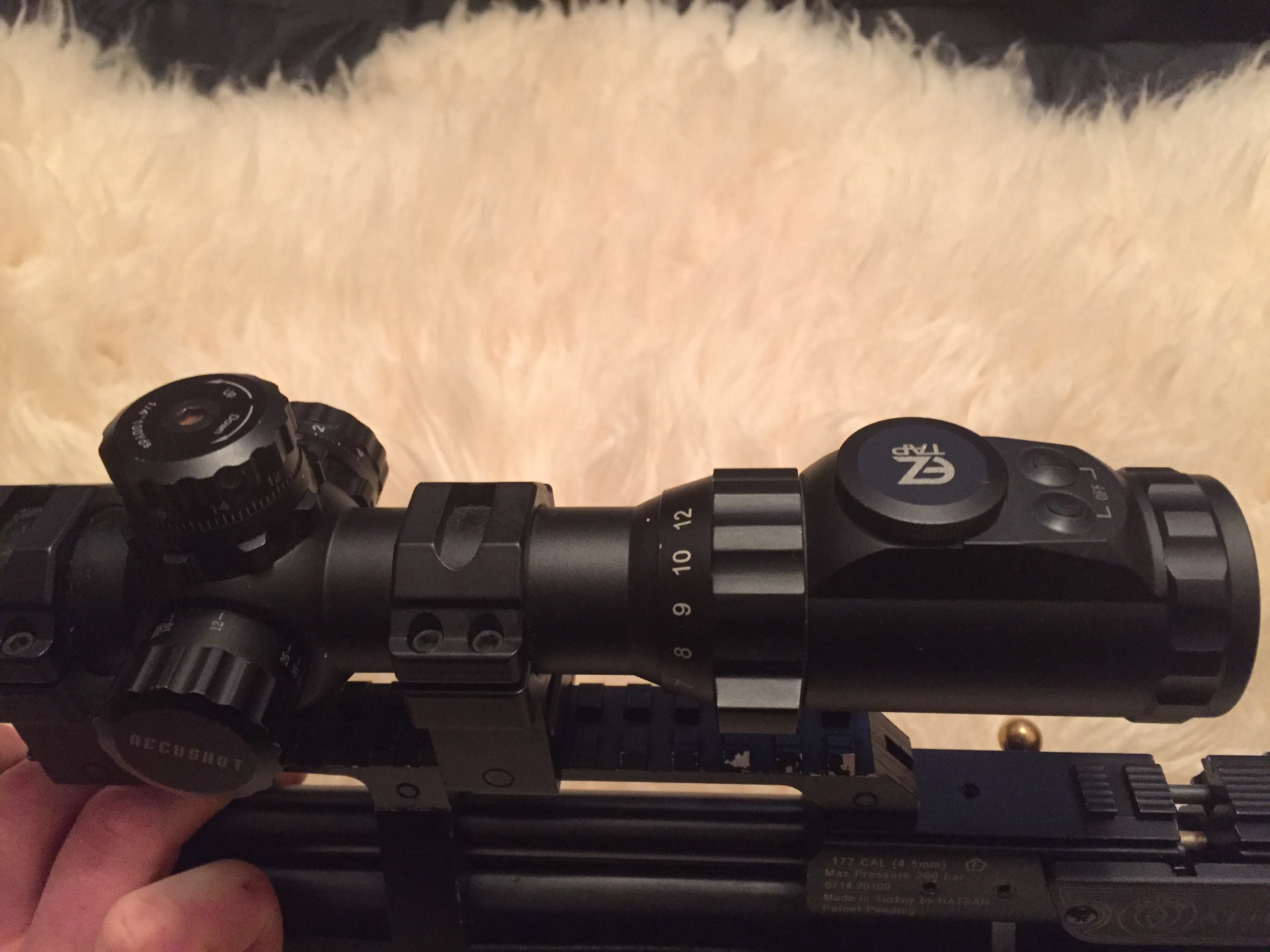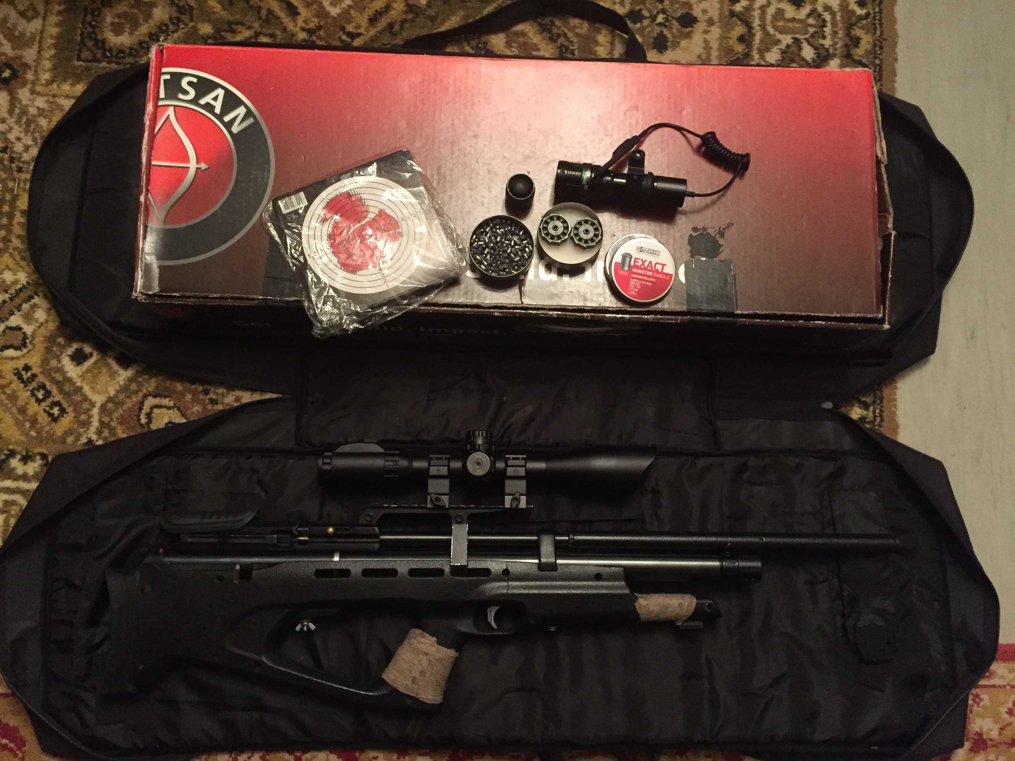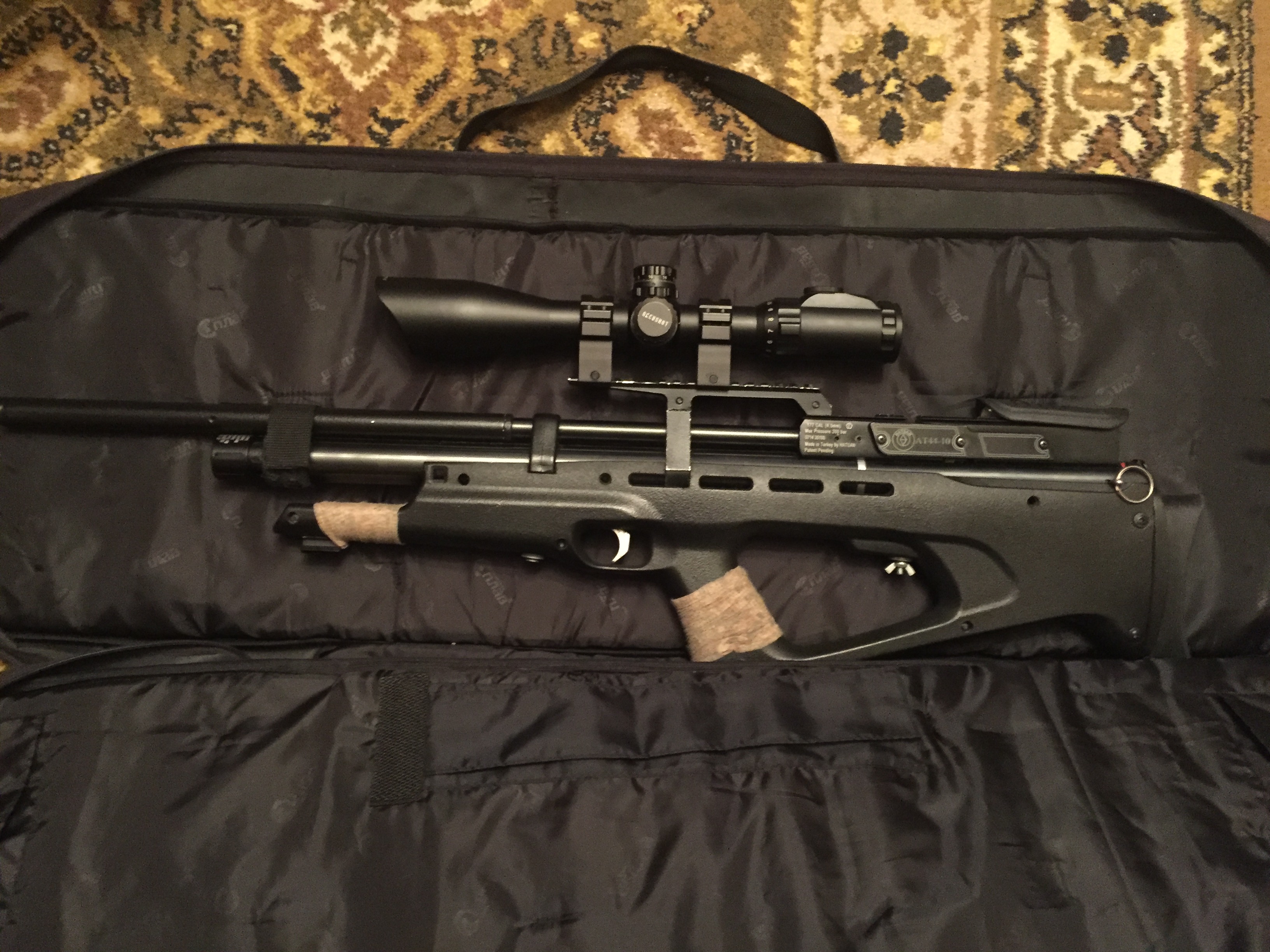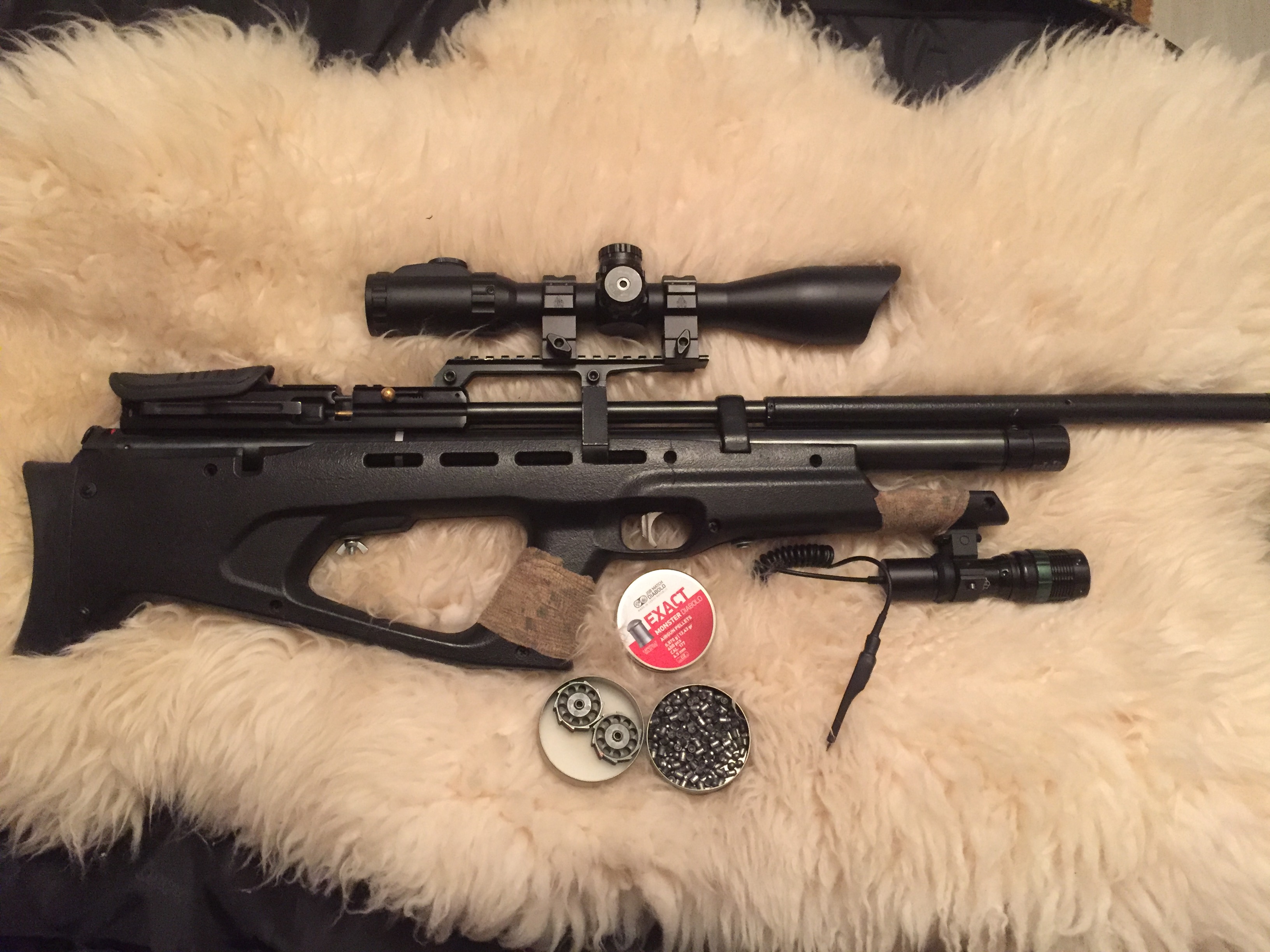 В комплекте правильный Липерс Аккушот 3х12-44мм с подсветкой. Кольца UTG высокие быстросъёмные. Зс-крюгеровская. Баллон 7литровый с мягким специальным чехлом. Подствольный фонарик с зумом. Домик для швайки так же на борту. Настрелял 6 банок.