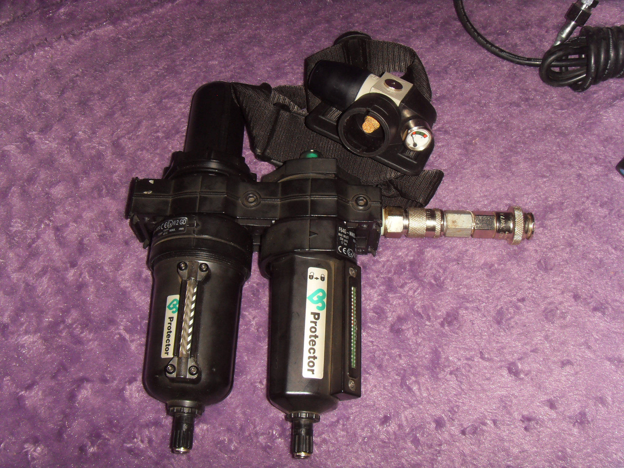 влагоотделитель! с регулятором давление! Другая колба предназначается для смазки! это та что с двумя колбами! Используют авто моляры! И люди работающие с пневмо инструментам! сам пользуюсь похожем!!!