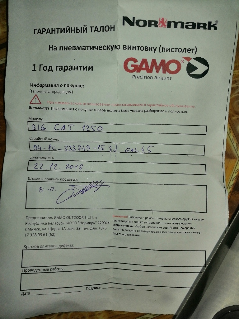 Продам пневматическую винтовку Gamo BIG CAT 1250 в практически новом состоянии, настрел... Пуль 30, полная комплектация, дополнительные колпаки на оптику, куплена 22.12.2018, Год гарантии магазина, покупалась за 450р. За нее прошу 350р. или равноценный обмен ,но больше интересует продажа, реальному покупателю скину на дорогу, нахожусь в Гомеле, админу добра, всех с праздниками)))[attachment]f5r5HRgXBSU.jpg[/attachment]
