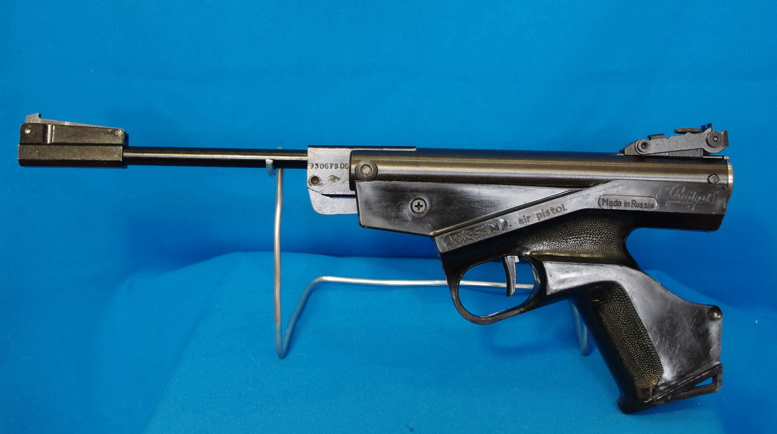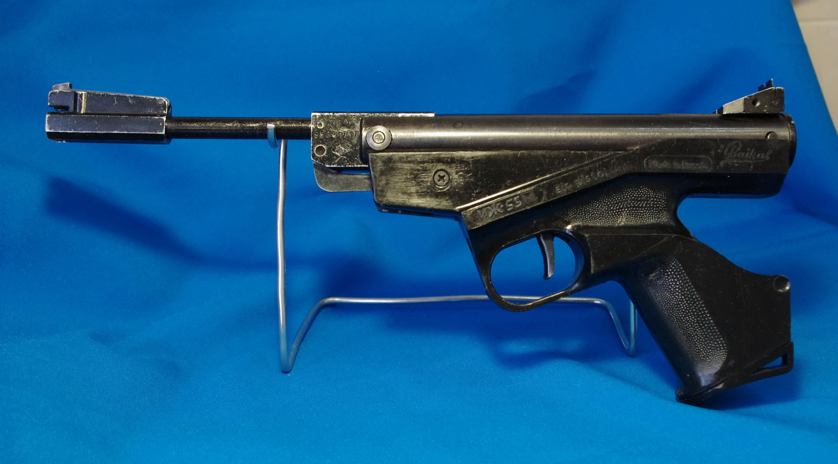 В достойном для его возраста состоянии. Установлены новые манжета, перепуск, пружина (крайние витки торцованы), задняя пробка. Ствол в хорошем состоянии, пулька проходит равномерно. Компрессор внутри не полировался, канавка на дне не заливалась. Есть паспорт.
