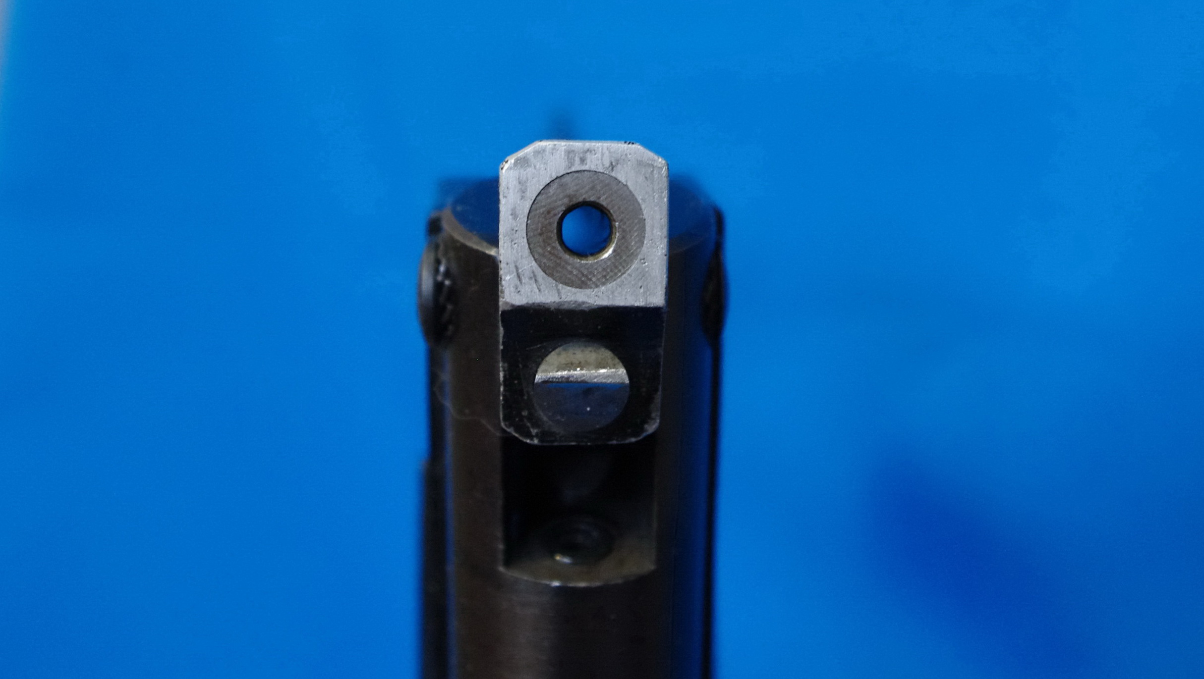 В итоге сборки: ствол задран вверх, хотя муфта не была пилена. В казне ствола было “ведро”. Так как сам ствол в хорошем состоянии, то решил повозиться с пистолетом. Обрезал казенную часть ствола, посадил в муфту с небольшим выбегом, но результат стал лучше не на много.