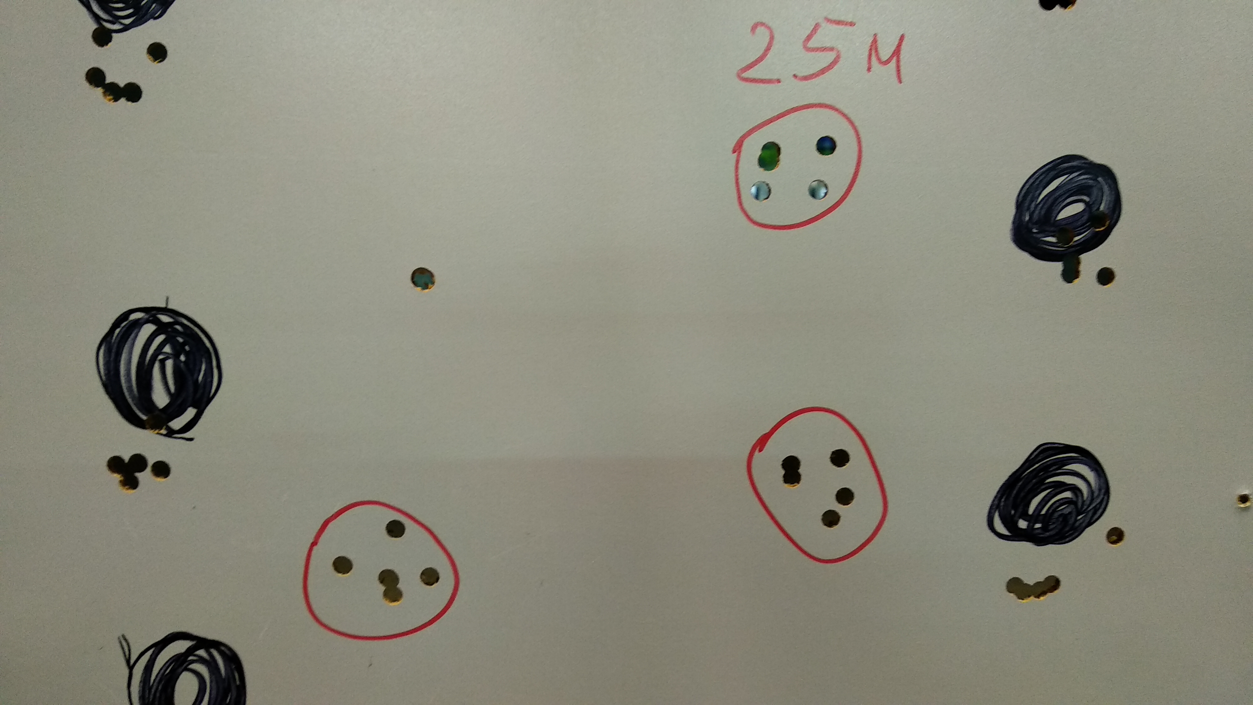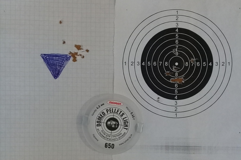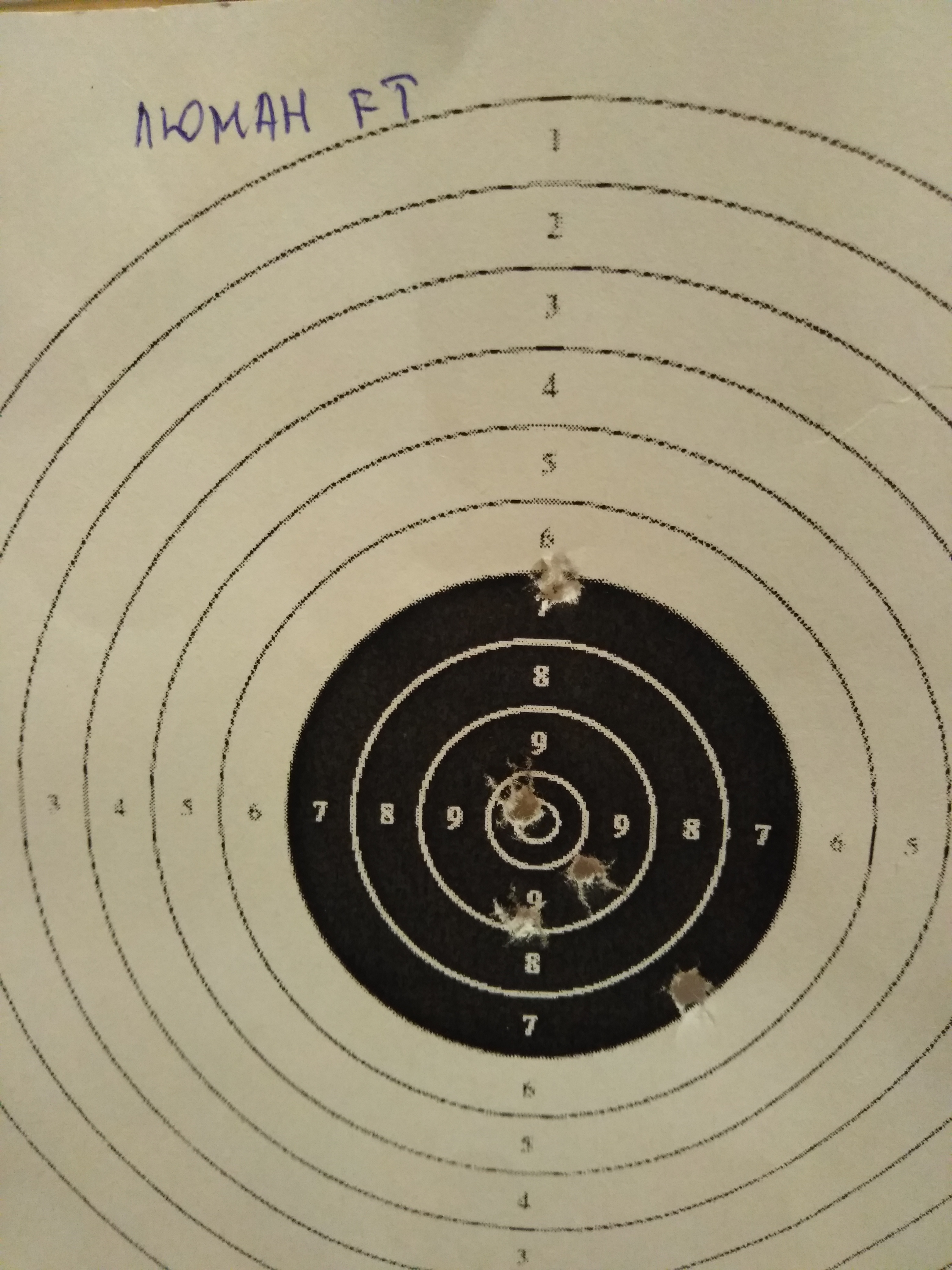 Люман FT 4,5мм 0,55гр., МР512 в стоке (7,5 Дж), стоя с рук, дистанция 10м. В каждой мишени по 5 пуль. Для тренировки самое то.