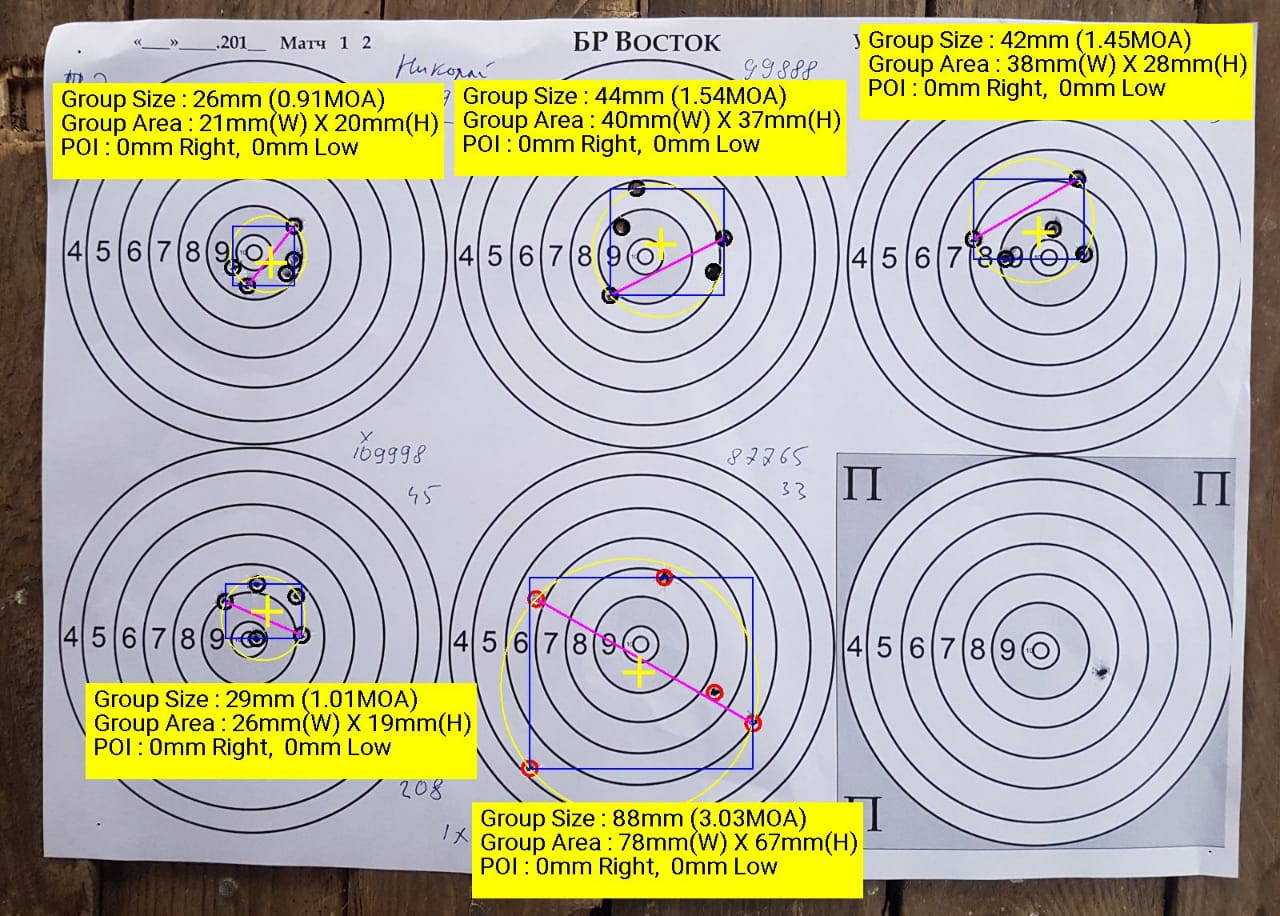 В указанном кучном диапазоне давлений средняя кучность по 5 выстрелам (4 раза) составила 1,2275 МОА, что по моему мнению более чем достойный результат. :co_ol: