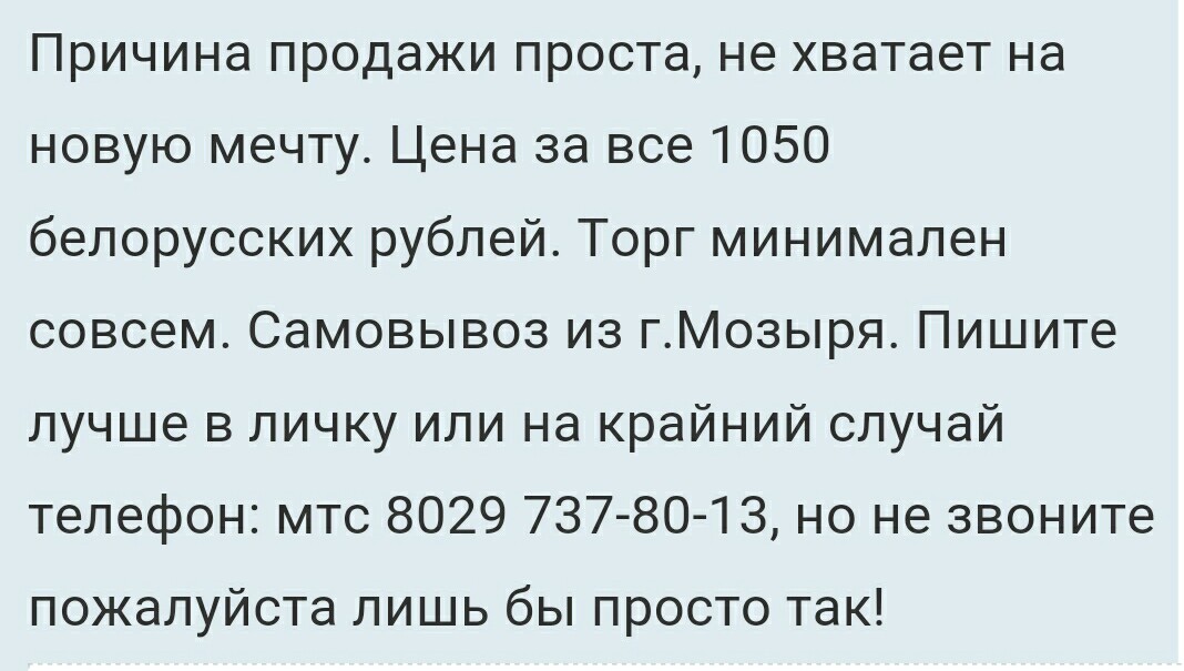 1.3 В первом сообщении темы должна быть указана цена товара в белорусских рублях! Условия приобретения, обязательно реальное фото ( не из интернета ) продаваемого товара.