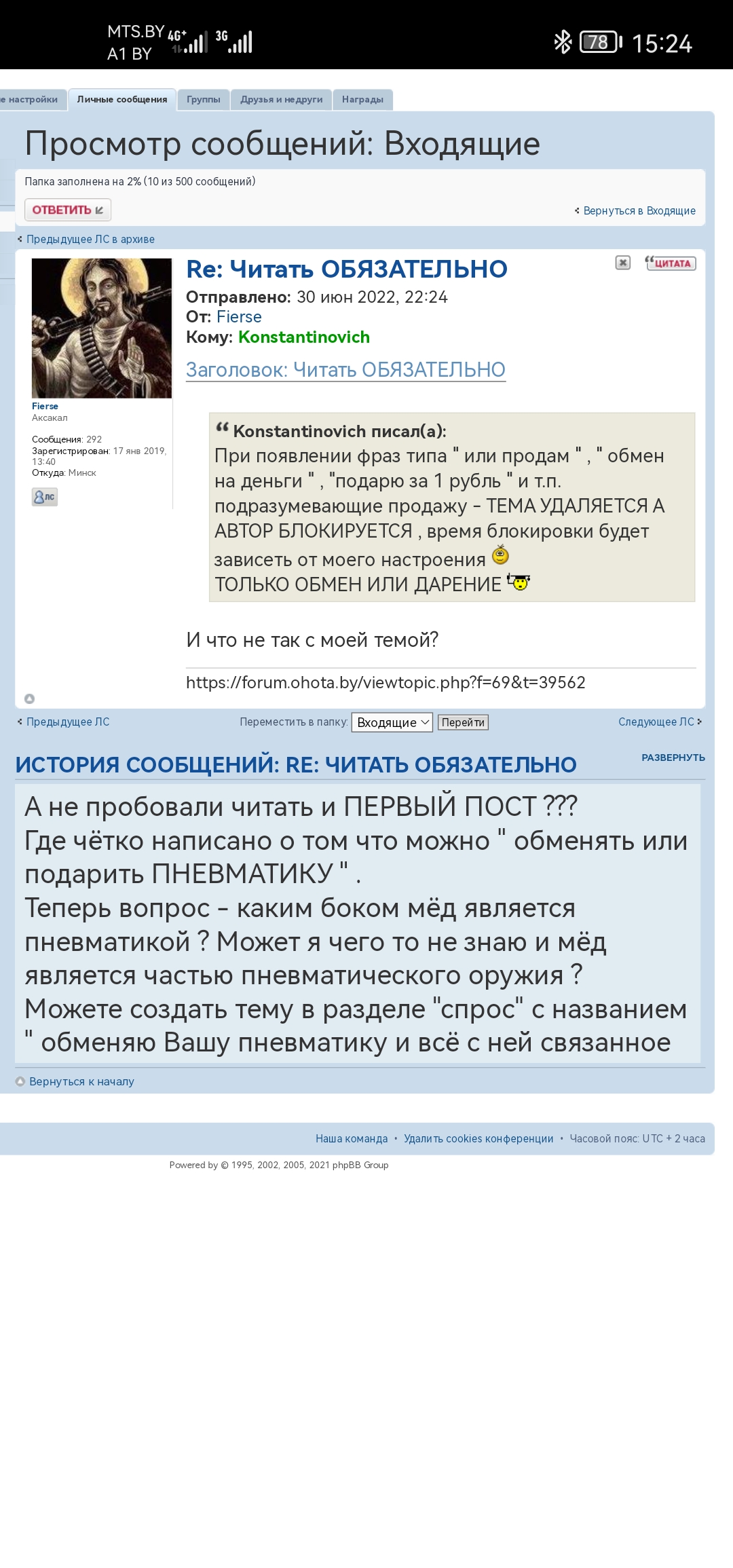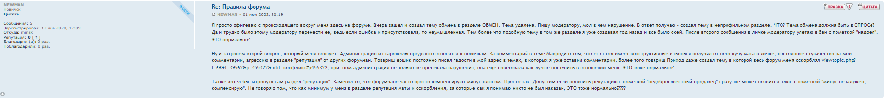 Я просто не сомневался, что ты не ответишь на мой вопрос. Как написал выше, я ту ситуацию схавал полностью как терпила. Вчера зашел на форум и создал тему. Константинович ее снес. Я как обычно через личку хотел узнать детали. Все оказалось просто моя тема ОБМЕНа в разделе ОБМЕН находится не должна, а должна находить в разделе СПРОС. Год назад я создавал похожую тему и все было норм. А что теперь? Злопамятный Константинович не может успокоится?