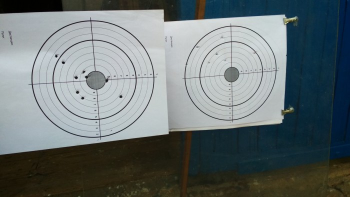 Расстояние 15 м с рук формат бумаги А4. Слева пули ДЦ плоскоголовые, справа OZTAY.