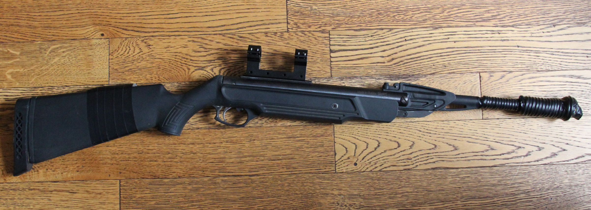 Из доработок: стоит ГП, манжета и перепуск от Петрухи, ствол укорочен до 34 см, доработан казенник, тяга взвода, спуск, утяжелен приклад, установлен затыльник для удлинения приклада, ствол утяжелен путем намотки толстого медного провода, приклад утяжелен дробью с монтажной пеной. Вес около 3кг, почти не лягается.