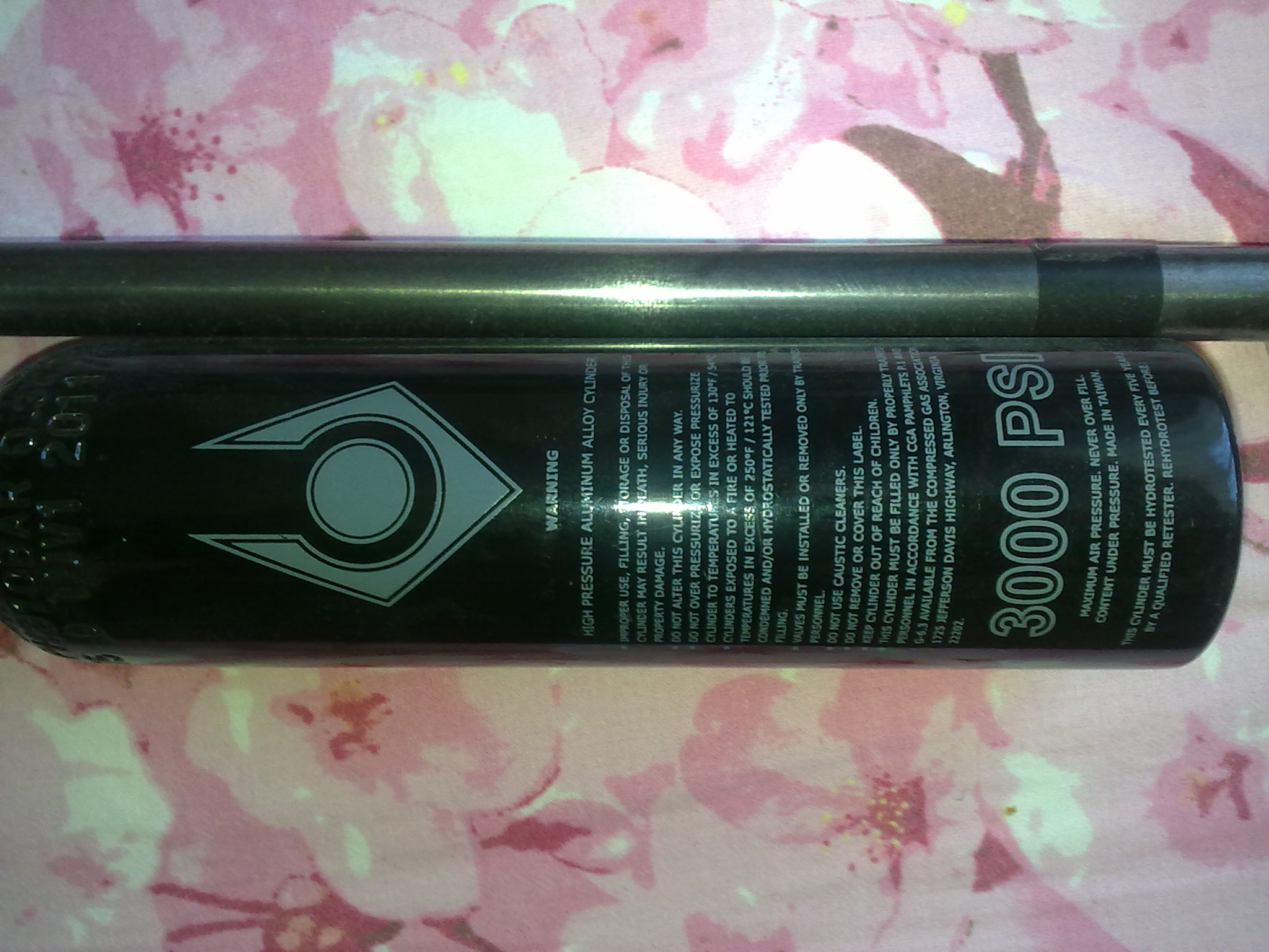 К сожалению сам мало знаю про эти колбы. Вот фото. Профессор утверждал что эта колба не из дешёвых. Рабочее давление 3000пси(200 атмосфер). Редуктор настроен приблизительно на 100 атмосфер. Скорость д65 пулей ЖСБ 0.67 . Кучку точно не помню в мулиметрах, но на 50 метрах заметно меньше 2 см (сам не любитель кучки собирать). Вообще кому в тире давал пострелять, хвалили точность. В комплекте всё что закреплено на винтовке на фото, и модер то же (кстати очень эффективный).