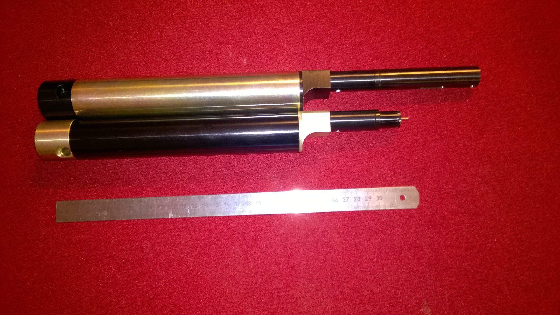 длинна 26 см. резик диаметр 40 мм. толщина стенки 5 мм. апрессован на 450 атм. труба 88 из цельного прута с проточками. три ударника на выбор. пружина. поджим пружины. заводское оксидирование и анодирование. как то так. всего 2 штуки. :-)