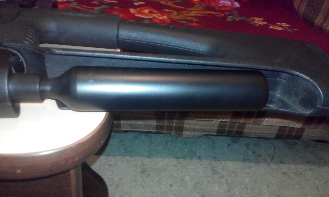Из апа ствол от ежа60 45см, баллон 88г с фторопластовым клапаном(опрессован на 300атм),типа саундмодер, шалтаи-балтаи убраны,где надо увеличены проходные, могёт раундами 155-160(сегодня в гараже заправил 88й и сразу одиночными)согретый могет 175 и выше