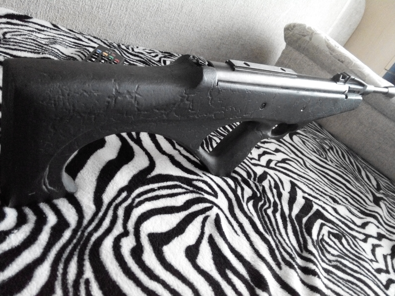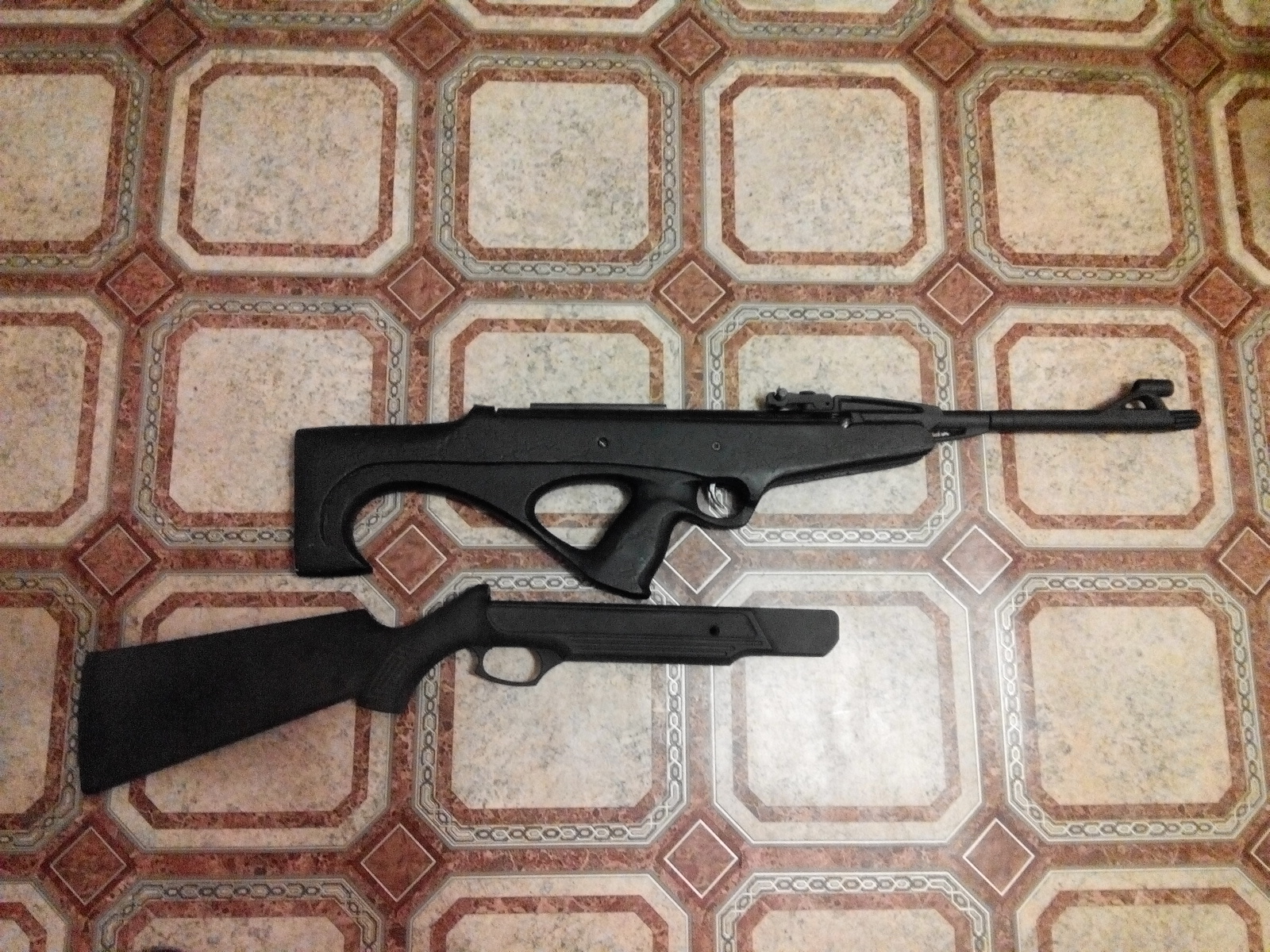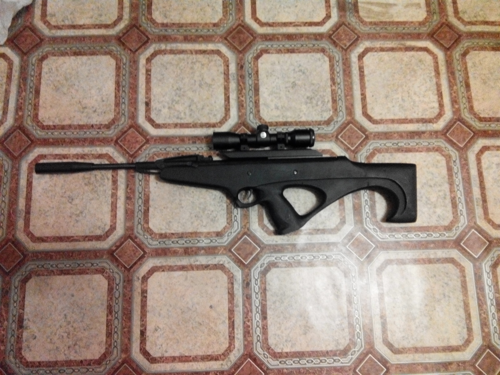 Пневматическая винтовка в компоновке Булпапп созданная на основе Ижевской пневматической винтовки МР-512. Выполнен перенос спуска. Укорочен ствол до оптимальных показателей - 30см. Надульник-утяжелитель интегрированный ( на всю длину). Ложе, изготовленное в единичном экземпляре, чёрное-матовое. Установлена газовая пружина, новая манжета, незадушенный перепуск. Винтовка под оптику. Возможен вариант с родными прицельными - идут в комплекте. Удобная малогабаритная винтовка.Цена -100 уй