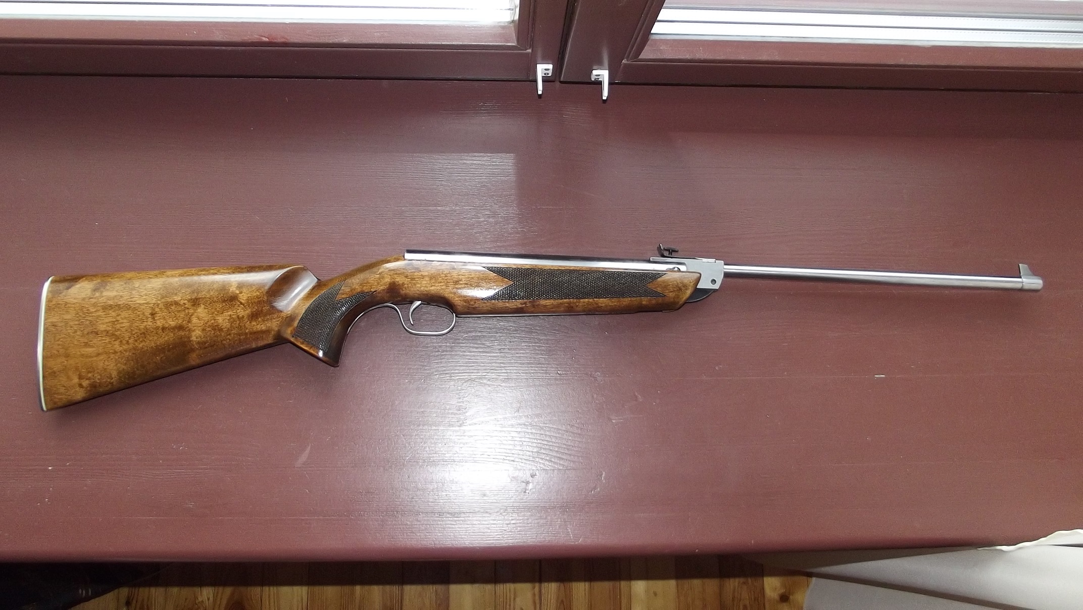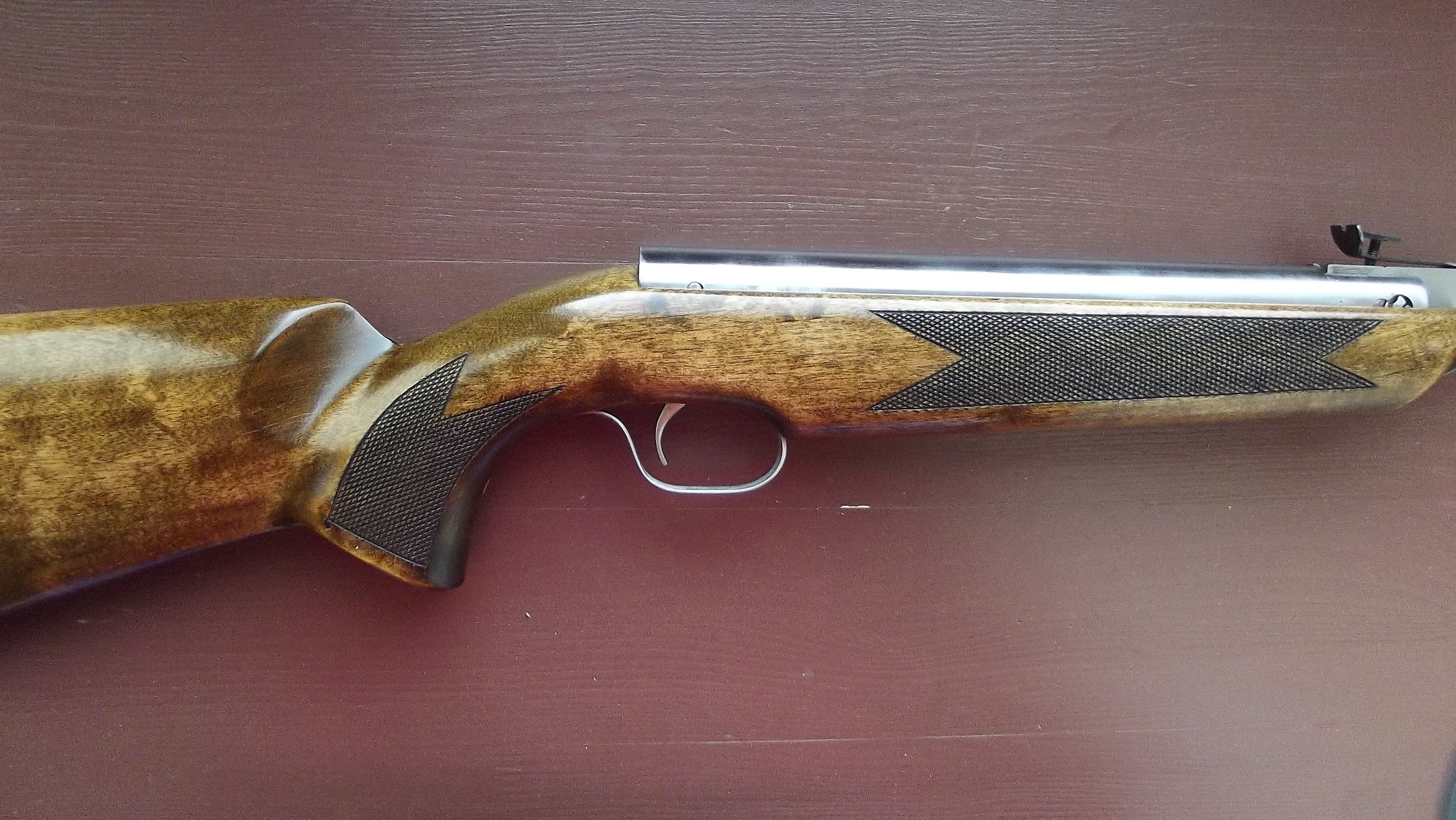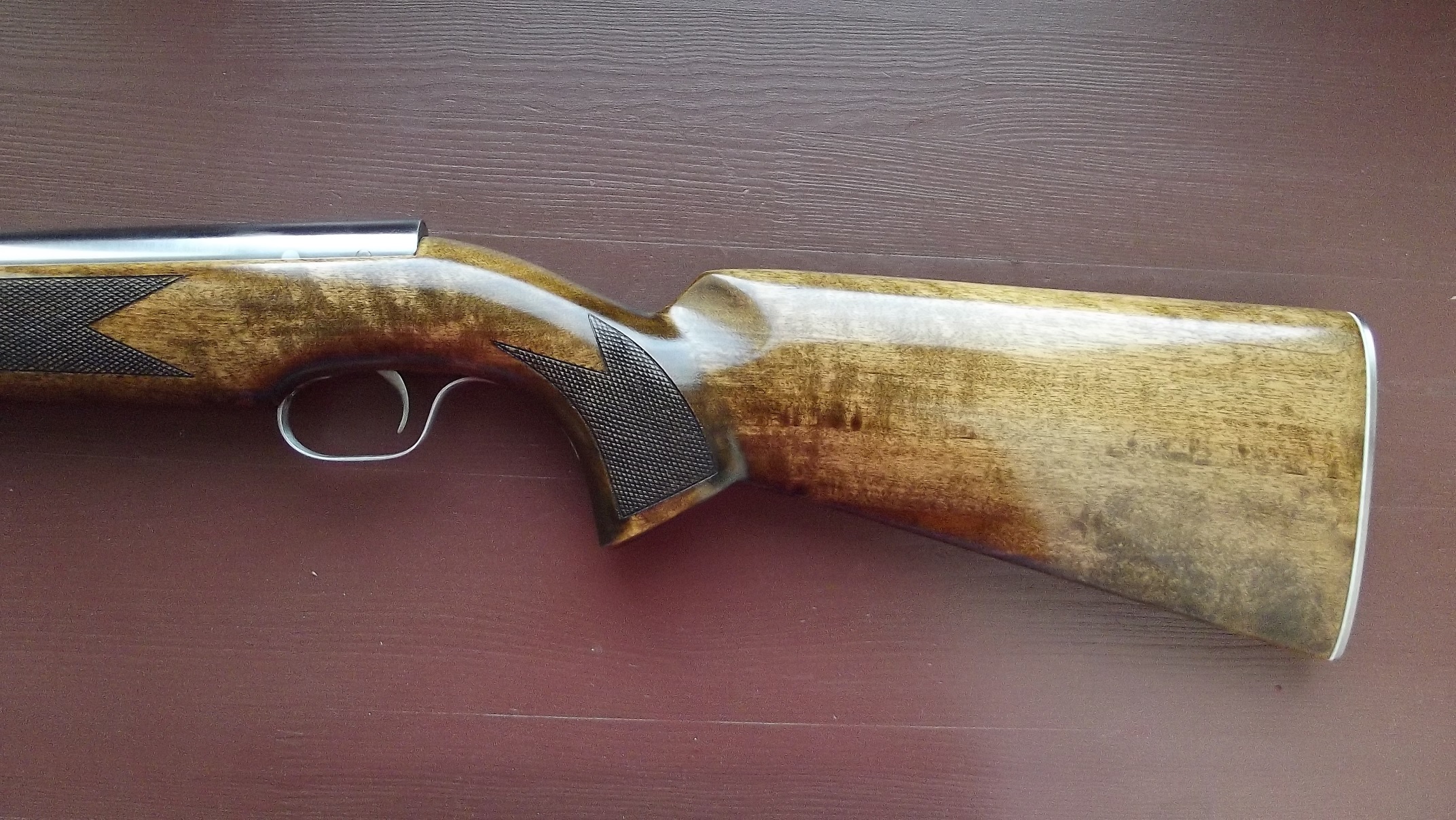 Все вылизано и доведено до ума - ничего пилить не надо: расточен и перенесен задник, полирован цилиндр, поршень под пластиковую манжету от мр 512, манжета с герметиком, утяжелитель поршня, перепуск 3,5 мм, короткий и мягкий спуск, приклад береза, насечка, пропитка воск, затыльник и курковая скоба из нержавейки.
