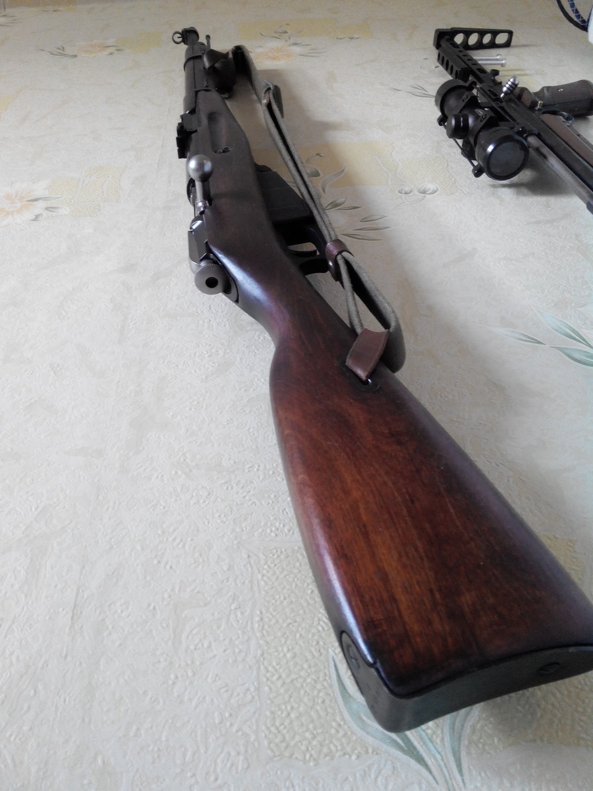 Итак. Имеется Gletcher m1891, с установленным гладким стволом 500мм и вложенный в оригинальное ложе карабина Мосина обр.1938г. Перезаряд осуществляется как и в оригинале - передергиванием затвора с подачей пули (шарика BB) в ствол. В комплекте оригинальный ремень с хранения. И впридачу кронштейн Кочетова под оптику ПУ(без базы).