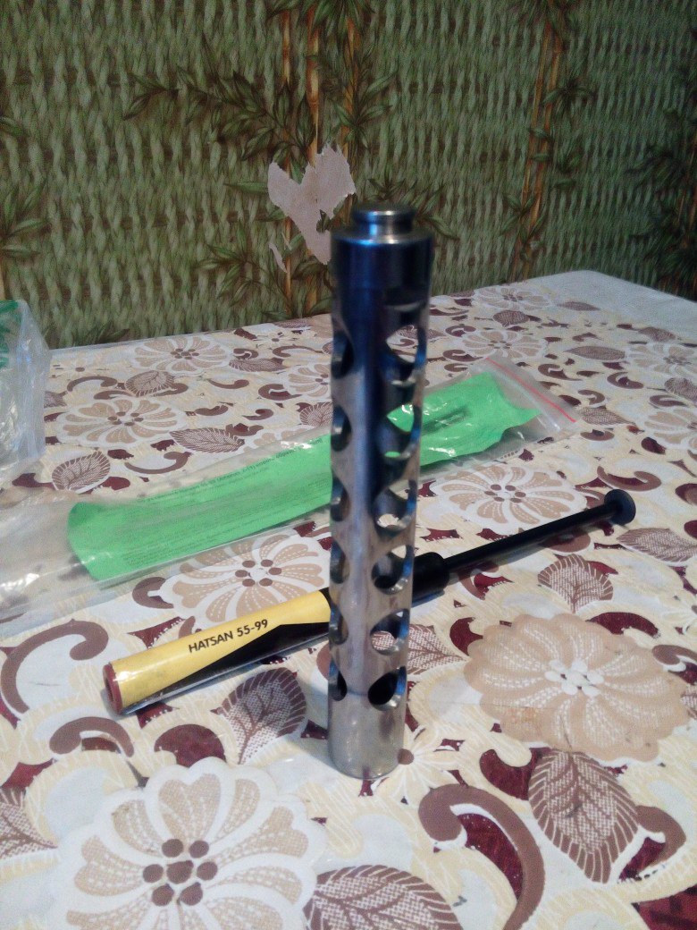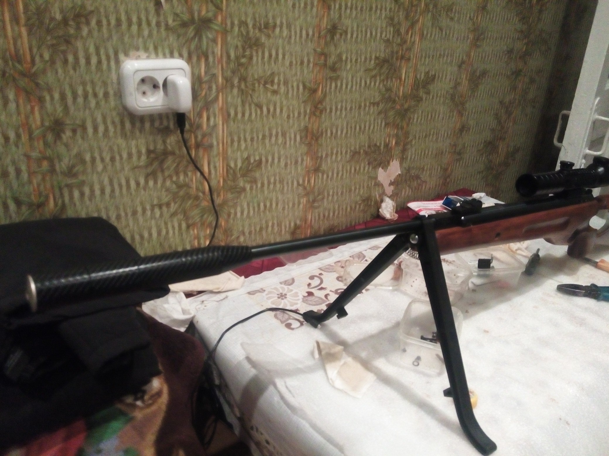 Облегчен и отпалирован поршень, отпалирован цилиндр, убрана вся говносмазка с УСМ, отполировано шептало, новая газ пружина и манжета, сделаны все фаски, убраны все заводские острые края и заусенцы, деревянное ложе, разборный 4х камерный модер, сошки, оптика Вальтер 3-9х32..