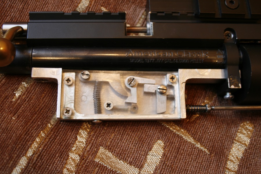 1)1377 с коробкой под мародеро барабаны,уплотнение досылателя резинкой в стволе,резик прямоток опресован на 400 атмосфер,длина резика 390мм,наружный диаметр 40мм. Дудка от иж 22 с латунным лейнером 12 нарезов,длинна дудки 350мм. Задняя пробка с возможностью поджима пружины ударника,ударник металический облегченный,вес точно не помню. Кусок трубы от кросман 1377. УСМ не родной виден на фото,на взвод становится сам без нажатия на спуск. Перенос спуска колхозный,желательно переделать,но свою функцию выполняет. Булка орех,задник резиновый из магазина "охотник". Рычаг взвода латунный изогнутый,есть железный прямой.