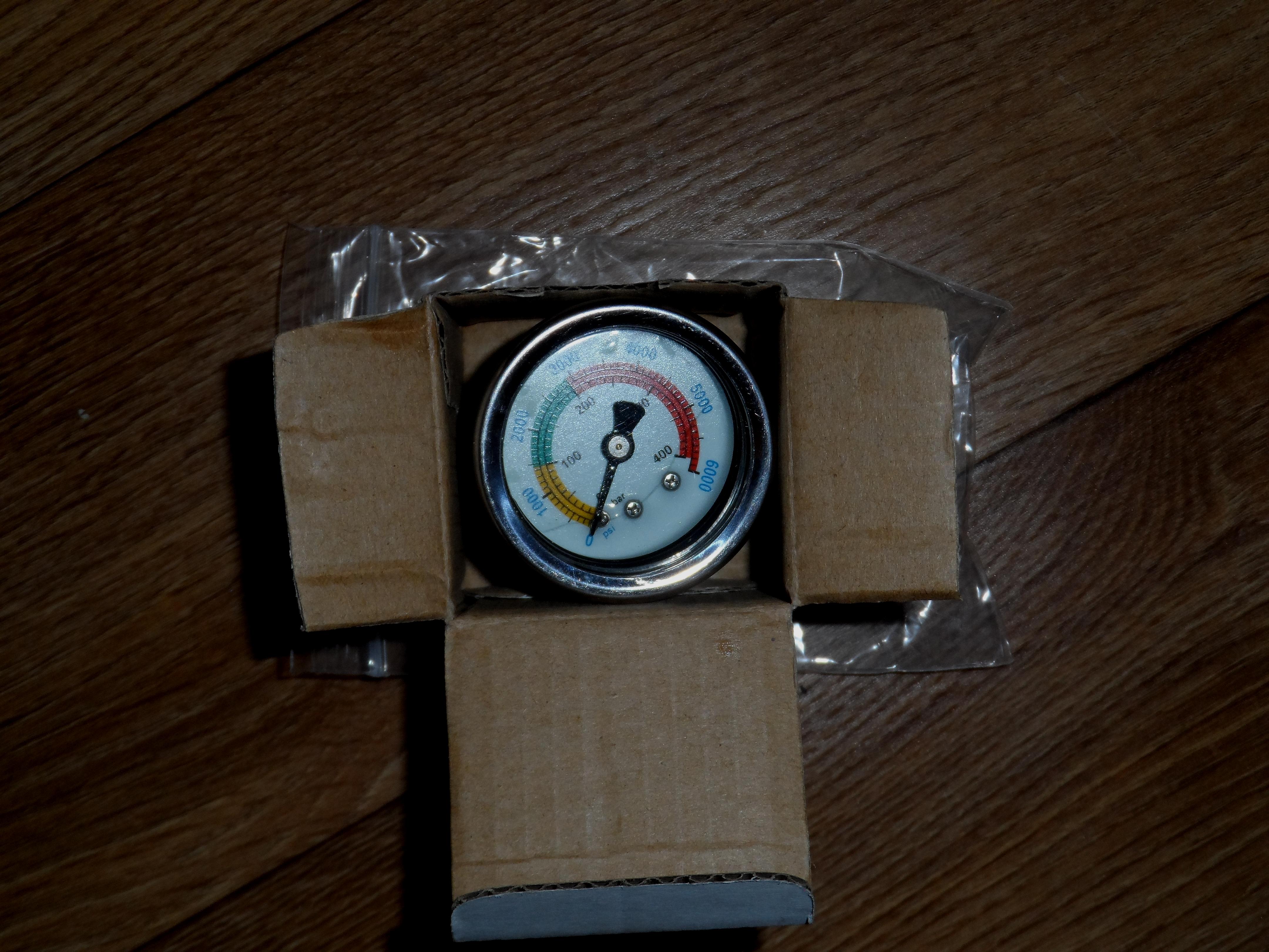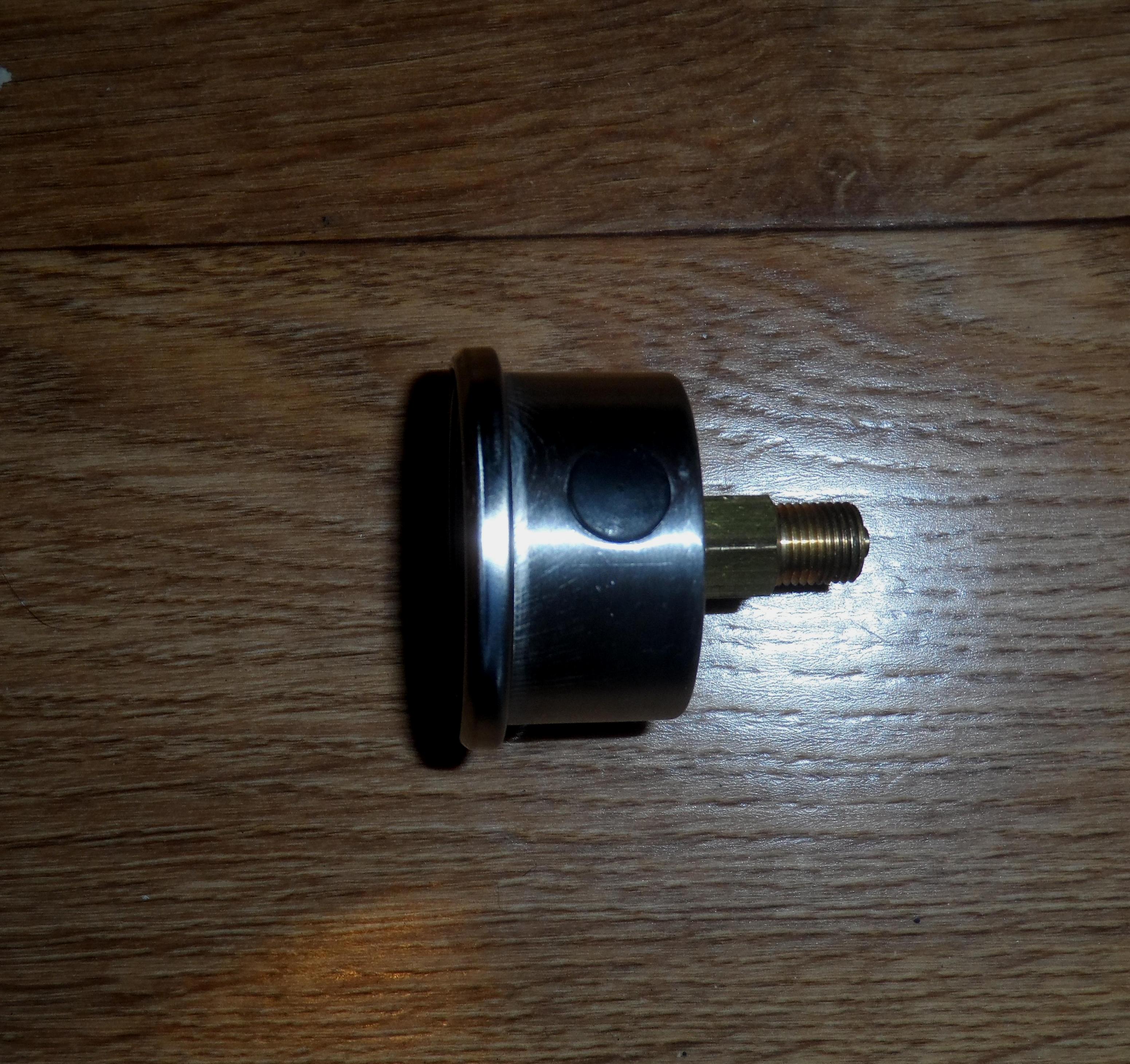 Манометр с резьбой M 10x1. Новый. С нюансом. Где-то слегка подтравливает воздух в саму камеру. Шипения не слышно, показывает нормально. Но глицерин вытек, так как камеры наполнилась воздухом и выдуло пробку. Вообщем без глицерина, но рабочий.