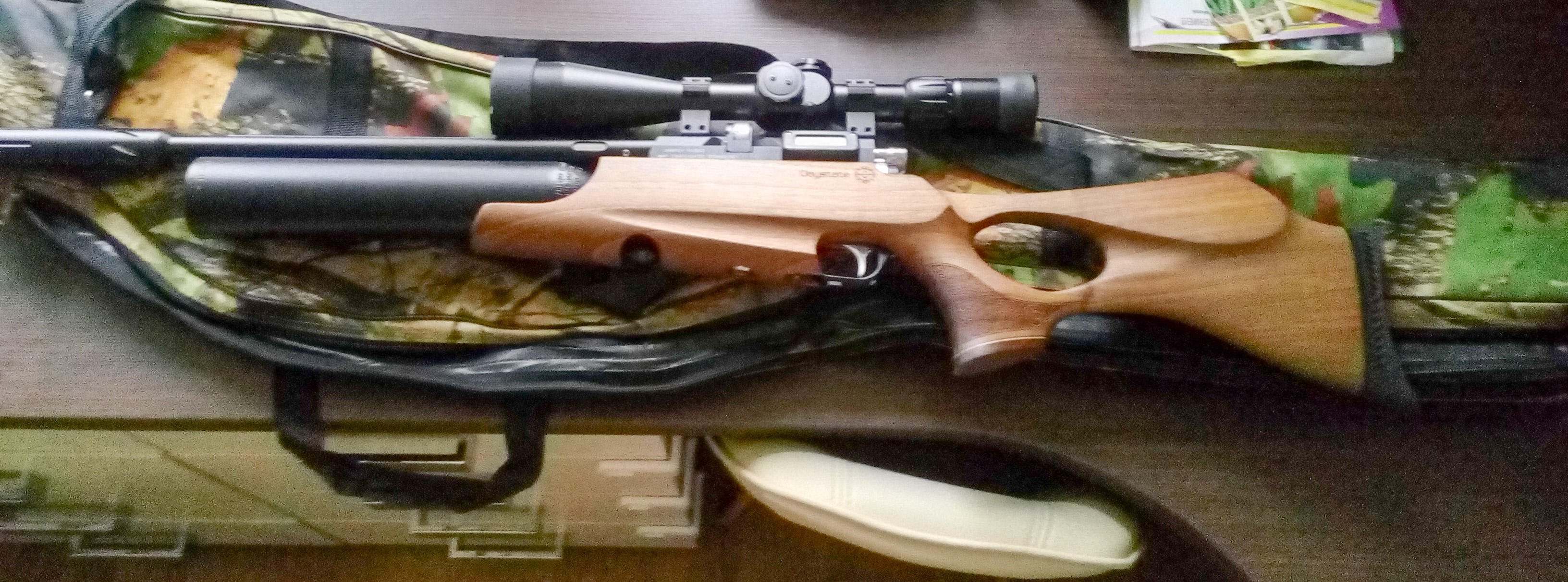Продам электронную винтовку Daystate AirWolf 6.35. Хочу 3900 BYN. В комплекте модератор Hugget(в ноль), барабан, приблуда для одиночной стрельбы, ЗИП(резинки),2 ключа.
