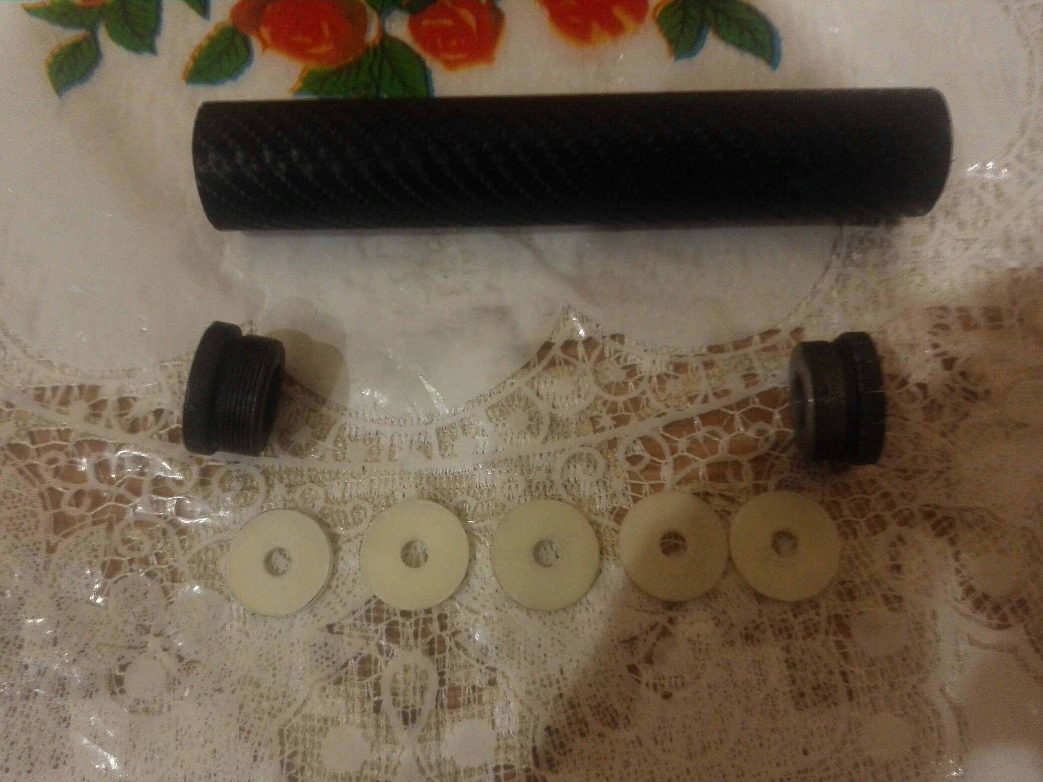 1. модер недоделанный, труба 30 стальная, длина 18см, пробки на резьбе, накручивается на ствол + 5 шайб из фторопласта - 20р