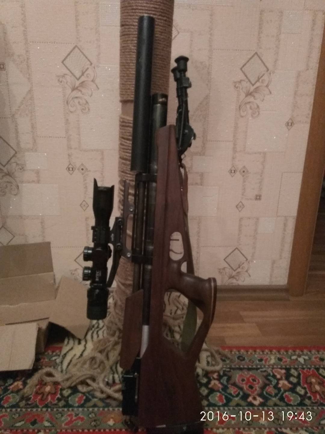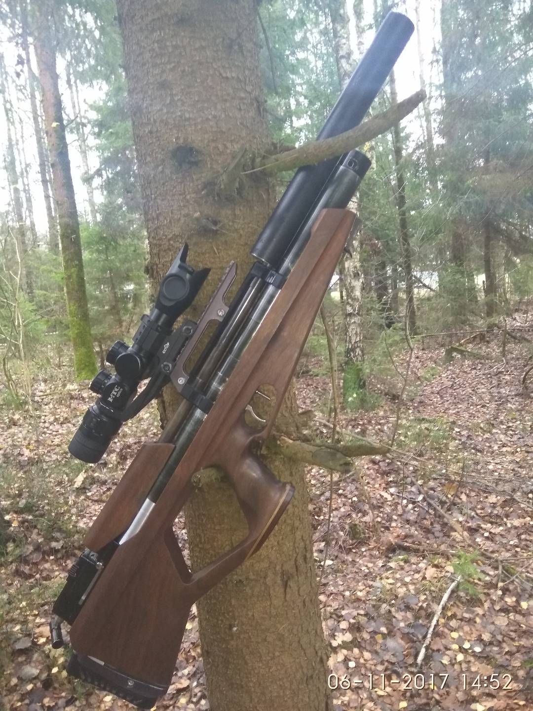 Дорестайлинговый Демьян-Т4 (нержавеющей досылатель и т.п.) Ствол LV бесчоковый 580 мм., Увеличенное заредукторное и редуктор от Hans, цельнофрезерованный полуинтегрированный модератор-работает на 5+, ложе американский орех. Отдам с ним 5 барабашек.