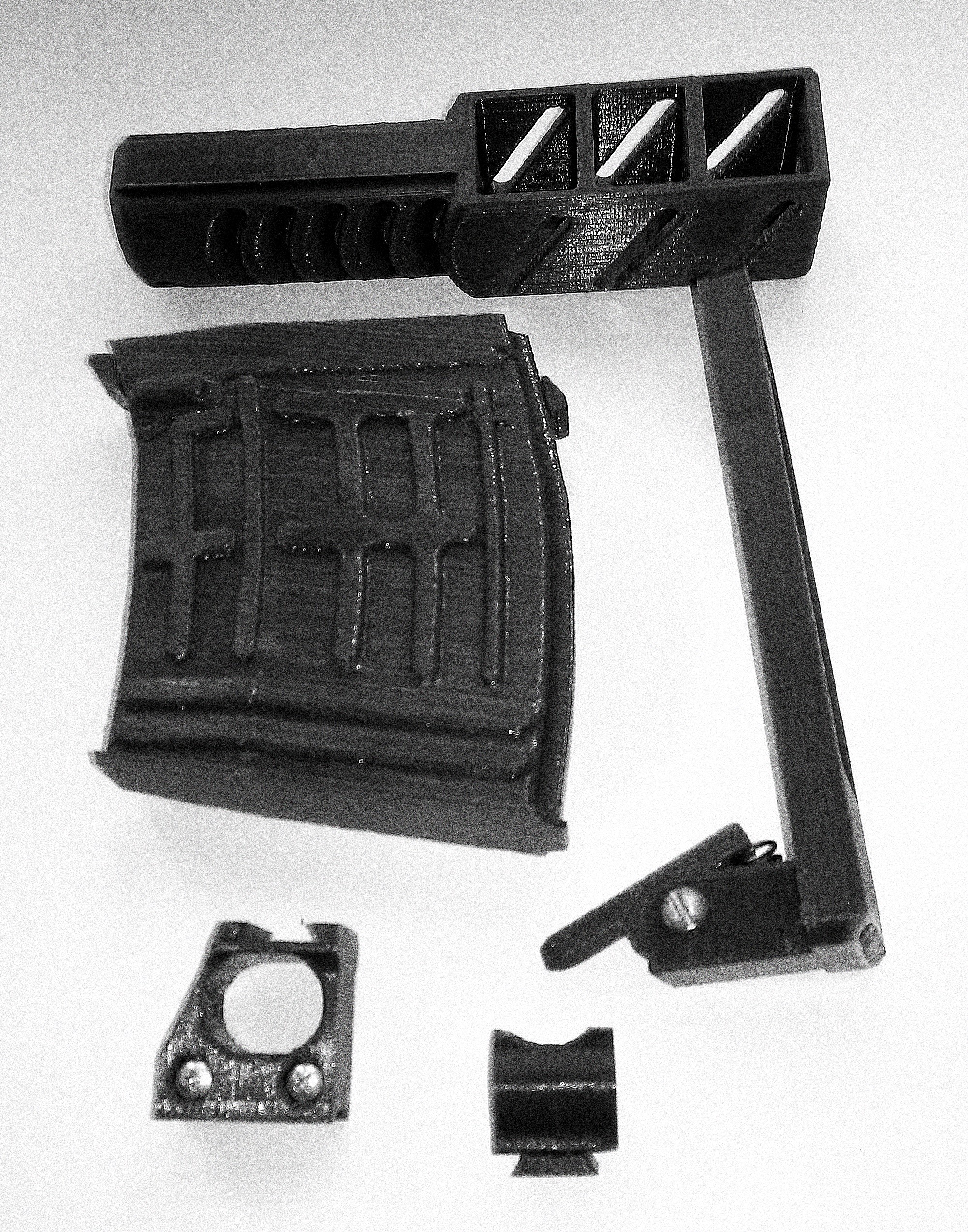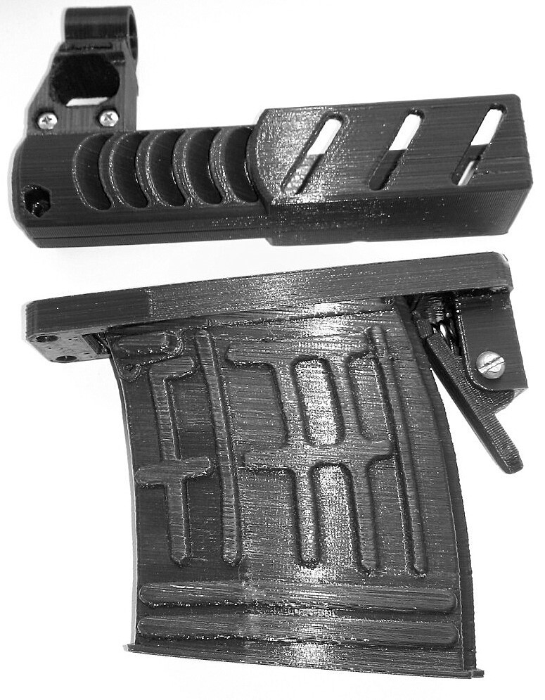 На фото: контейнер для переноски и хранения пулек в стиле магазина СВД, мушка регулируемая с стиле СВД, надульник с стиле ДТК Ильина с ластохвостом.