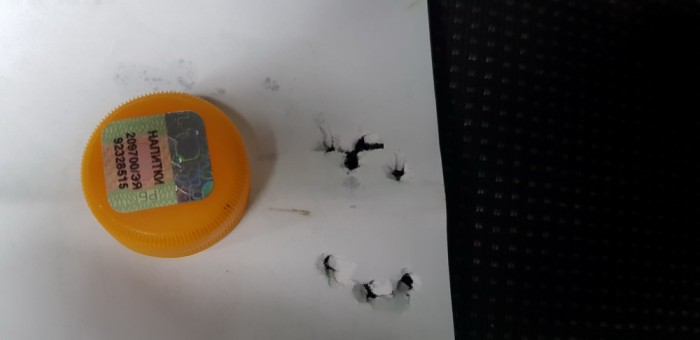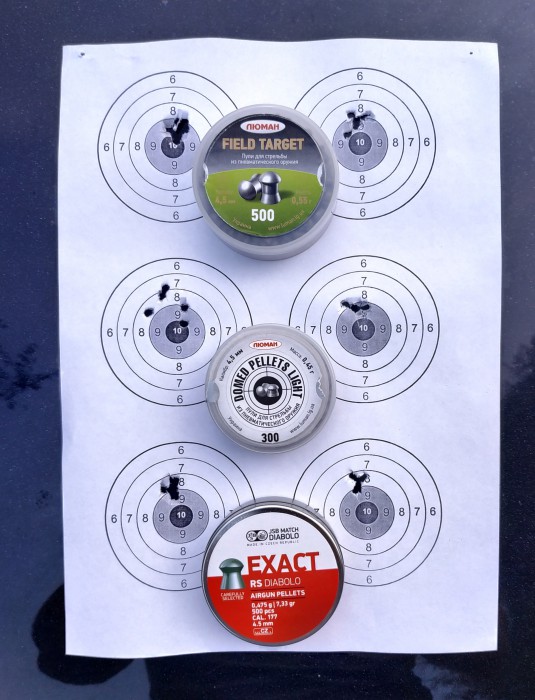 Отстрел на кучность из Feinwerkbau 300S, диоптрический прицел, открытый воздух, с багажника машины, 2,0 метра, в каждой по пять штук.