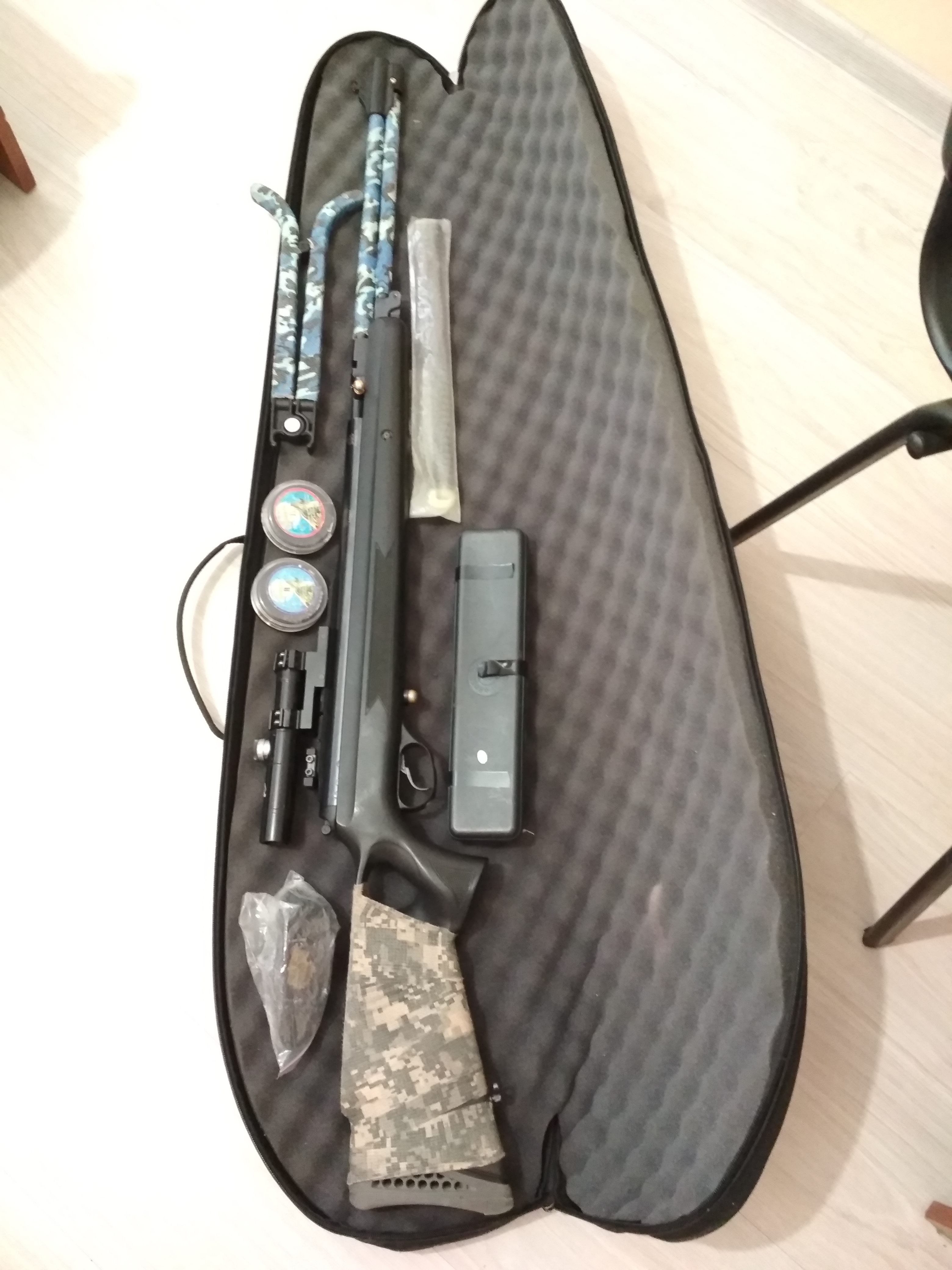 Винтовка, сошки, запасная пружина и манжета, 3 накладки, набор для чистки, пули, чехол.