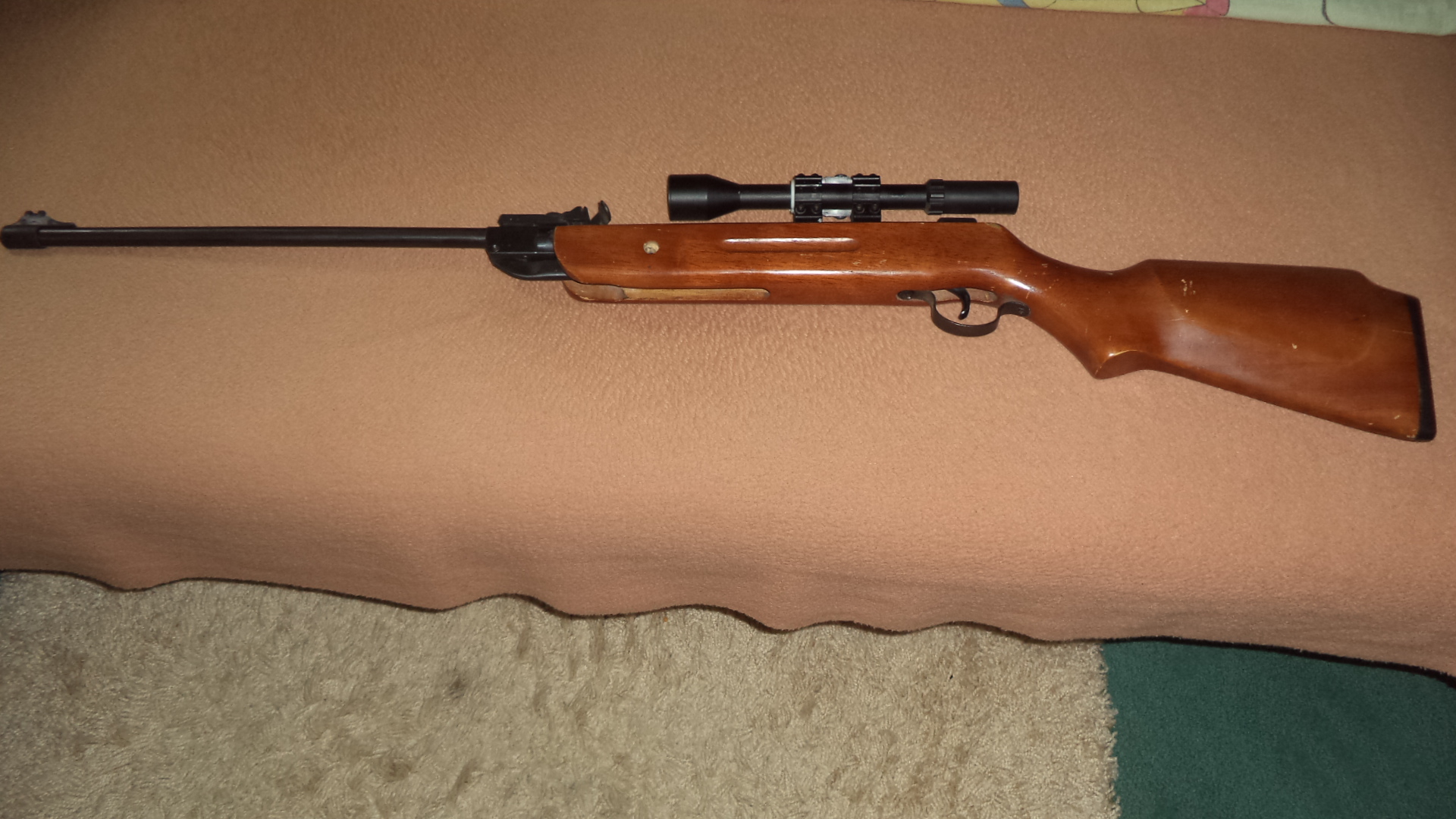Продам винтовку , скорее всего Шанхай . Ствол переламывается после нажатия на рычажок. Винтовка не исправна, при переломе поршень сам возвращается в первоначальное положение( УСМ не держит поршень на защелке). Установлен прицел Штурман 4 на 28. Приклад (ложа) дерево покрытое лаком, есть царапины на лаке.Калибр 5.5. Ствол ровный, открытые прицельные на месте. Досталась в придачу при обмене.Владелец сказал что зализана защелка (шептало) УСМ. Все остальное в рабочем состоянии. Может кто хочет повозиться. Цена за все 100 рублей. Пересыл. Сморгонь. МТС 336863322.