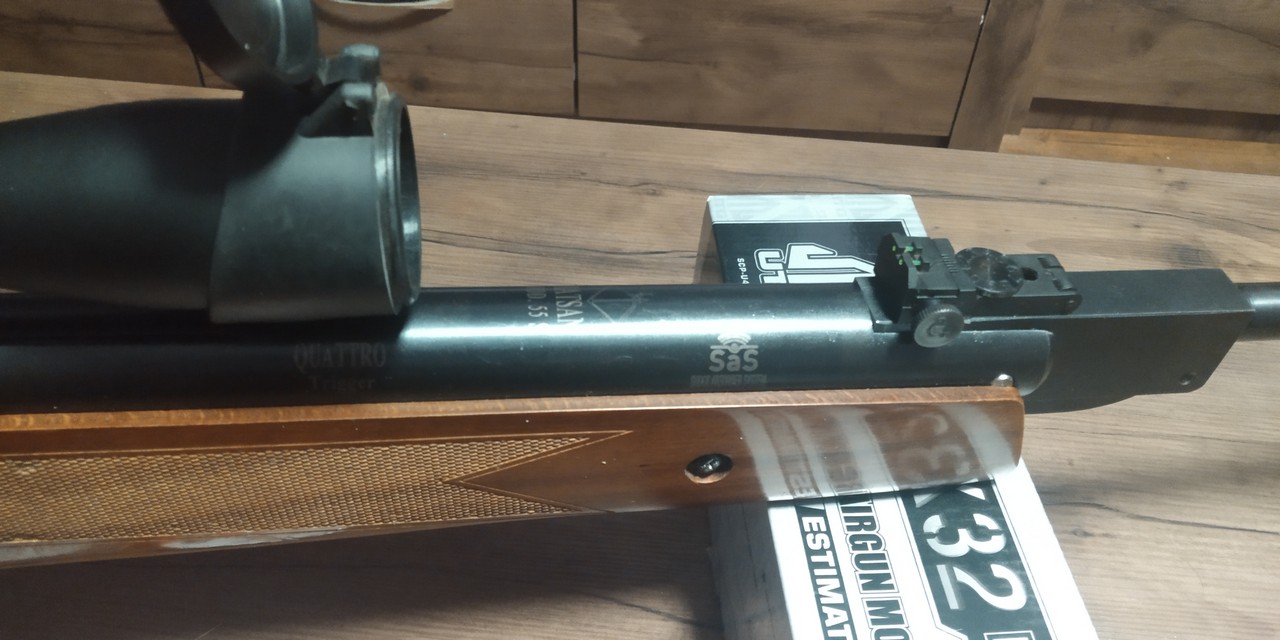 hatsan 55s в дереве 4.5, год винтовки 2012, состояние при этом 9 из 10, по виду только небольшие внешние коцки на дереве, и следы эксплуатации на металле. по тех. характеристикам, все идеально, стоит обслуживаемая ГП, скорость по хрону 0.65 около ..70 в секнду, продается, естественно в режиме 3 дж, установлен новый ригель, новый болт крепления ствола, старый в комплекте, сделана дульная фаска, вообщем вылечены все болезни ведродыра))), на руках приятная, досмотренная винтовка, очень мягкий и приятный взвод, без лишних треней и звуков, спуск тоже доработан, очень легкий. установлен надульник, чисто декор, родные прицельные в комплекте, и оптика leapers 4x32 full size tactical на кронштейне с флипами, родной упор под оптику снят, отлично держится за счет упорного болта в кронштейне. по кучи не скажу, но на моих 15 м., стрельба по крылышкам из бутылок с упора 9 из 10). аппарат бери и стреляй и получай удовольствие.