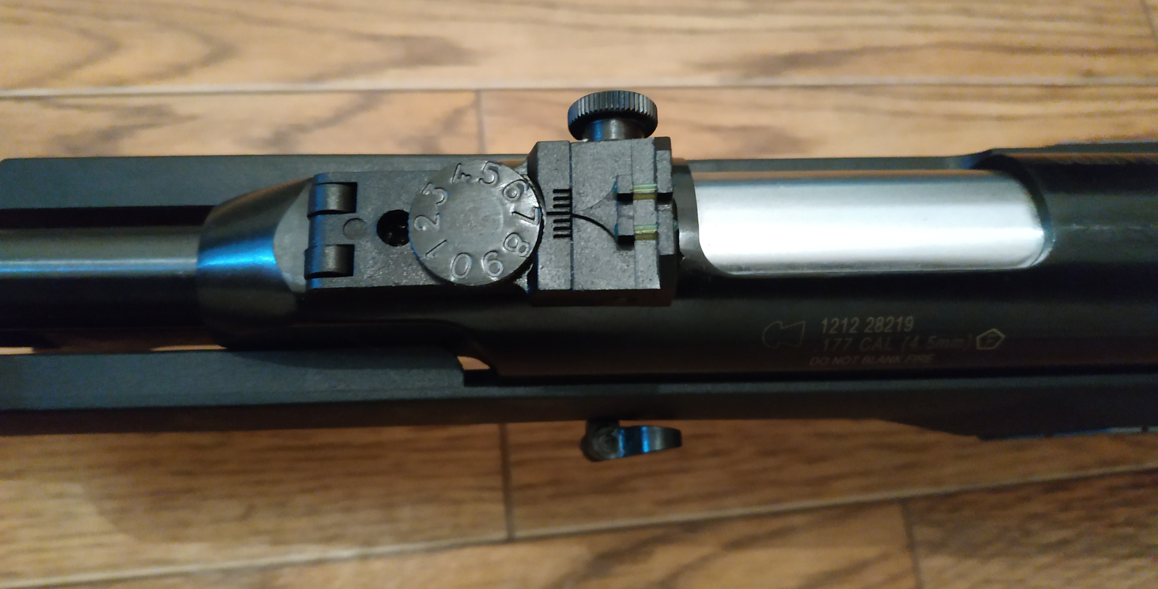 - Штатные прицельные приспособления регулируемые, мушка и целик, оборудованы фибероптическими нитями.