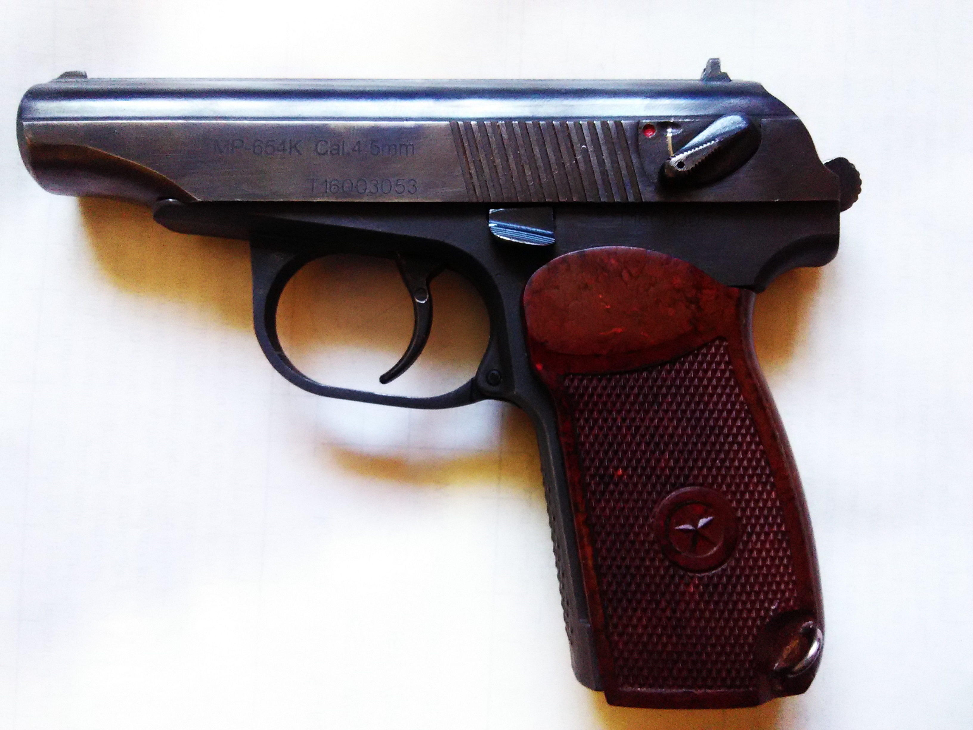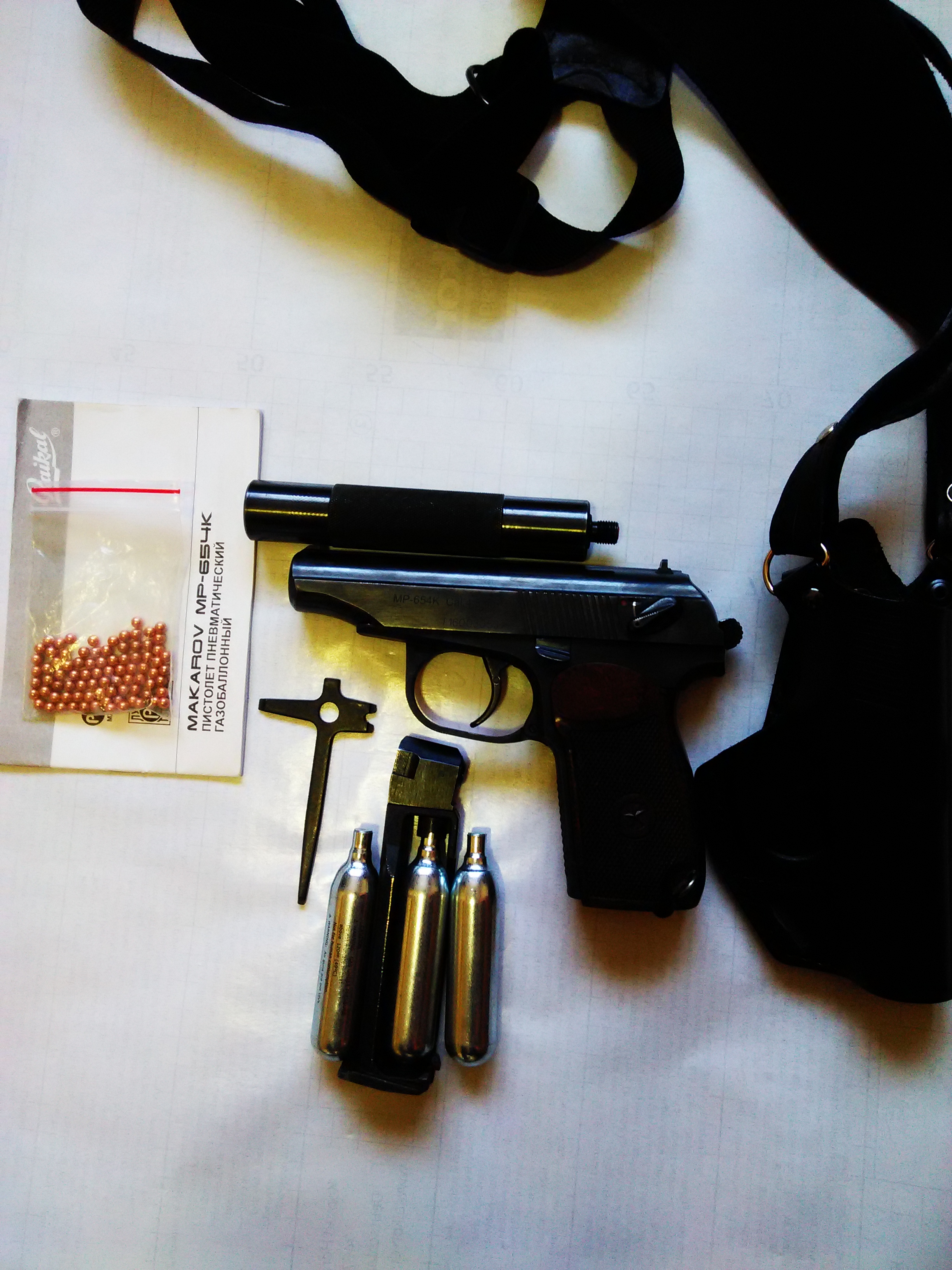 Продам МП654К 200р. Комплект полный: документы бакелитовая рукоять,зип, удлинитель ствола, 3 баллона, шарики, кобура скрытого ношения, нарезной стволик (заменён на гладкий).
