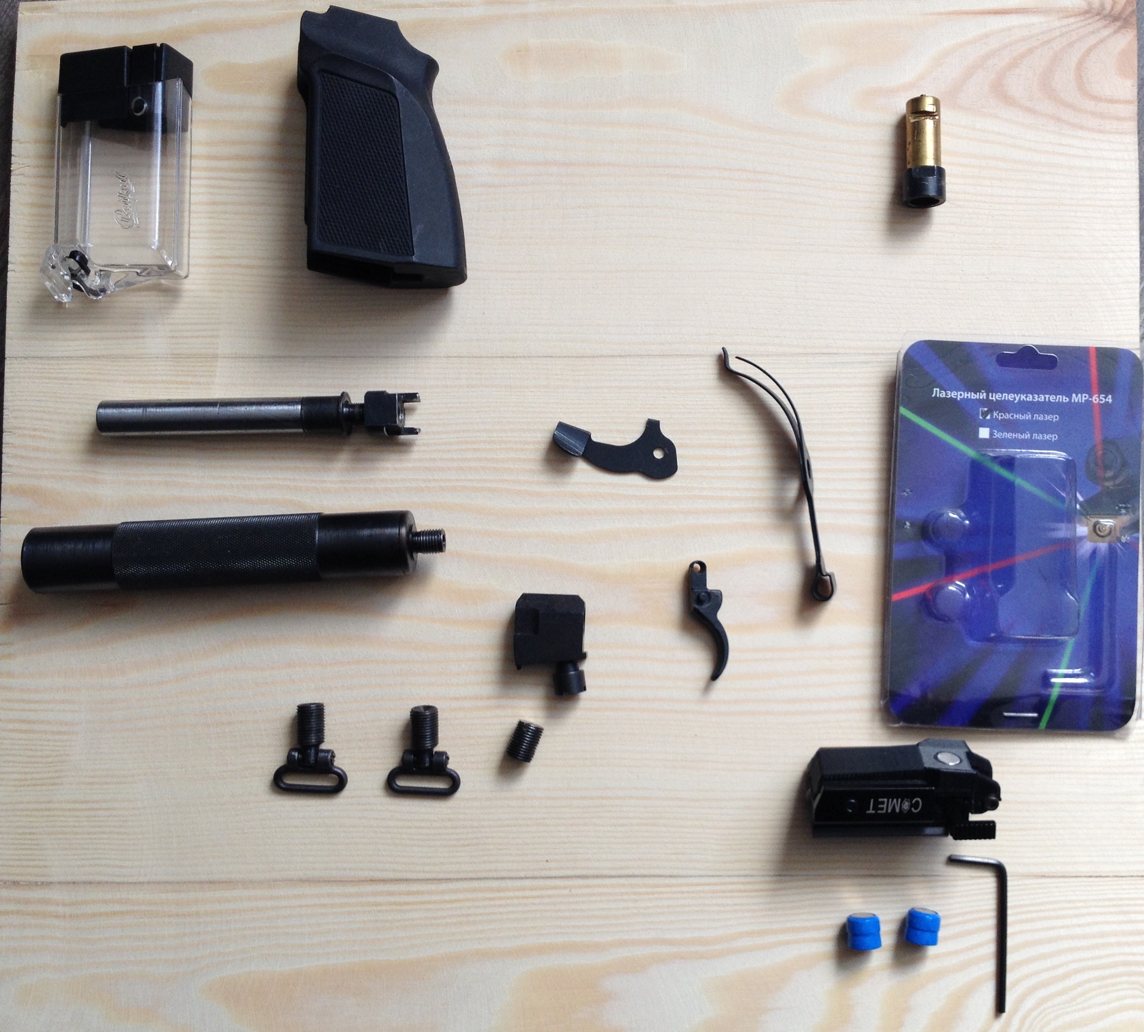 Запчасти (все сток, стволик кажется гладкий) плюс лазерный целеуказатель.