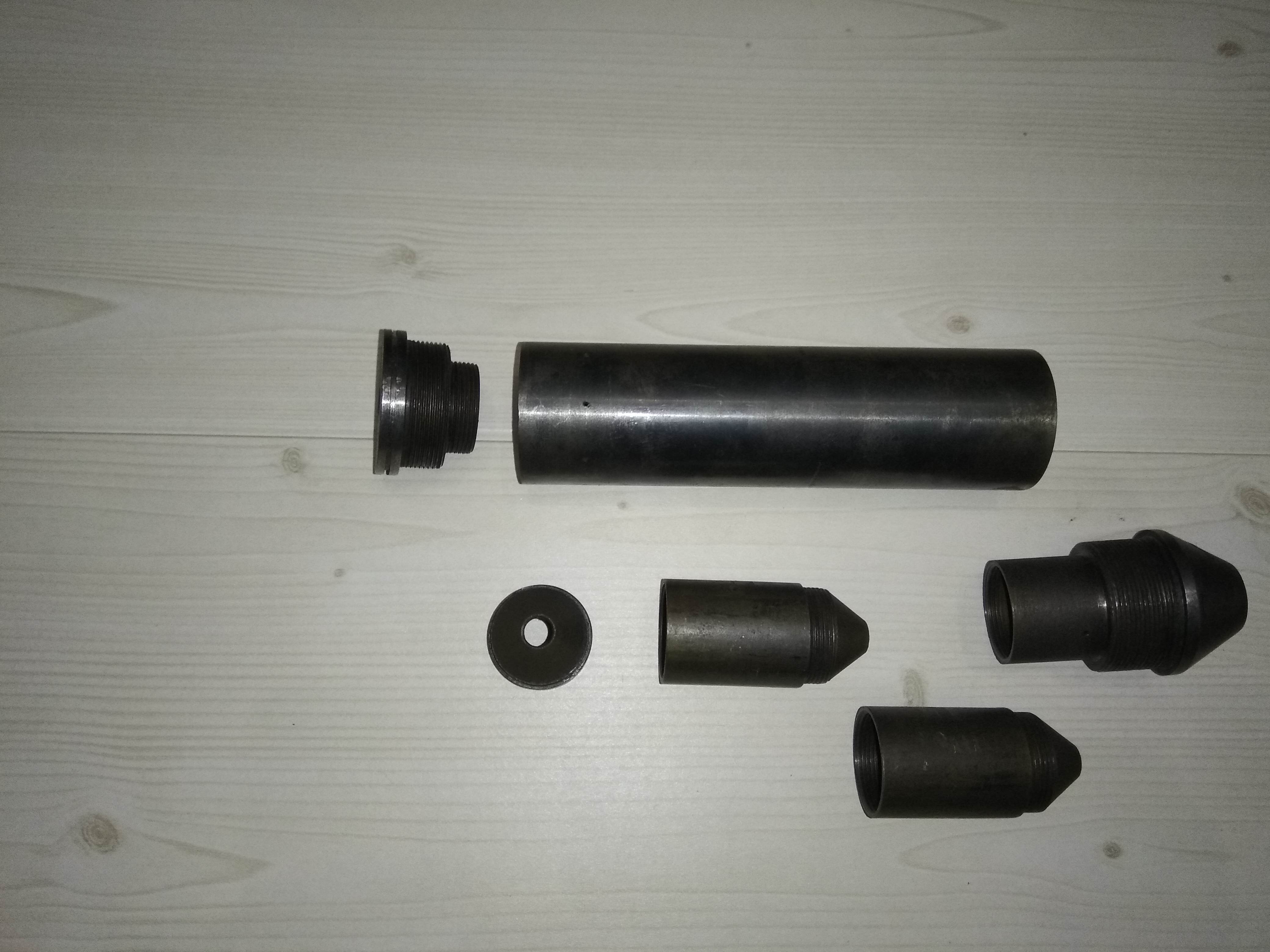 1. Чудо инженерной мысли- надульник/модератор/утяжелитель,:))) под резьбу м12х1. Максимальный вес-439гр, минимальный-340гр. Длина 140 мм, диаметр- 33 мм. Материал- сталь. Внутри 3 стакана, диаметр отверстия в пробке и стаканах 6мм. Все вкручивается друг в друга на резьбе. -30руб.