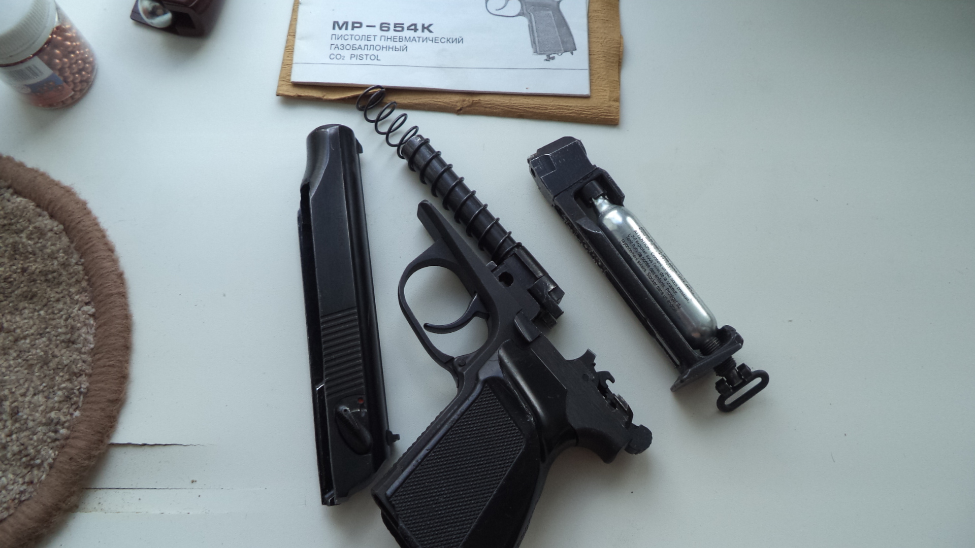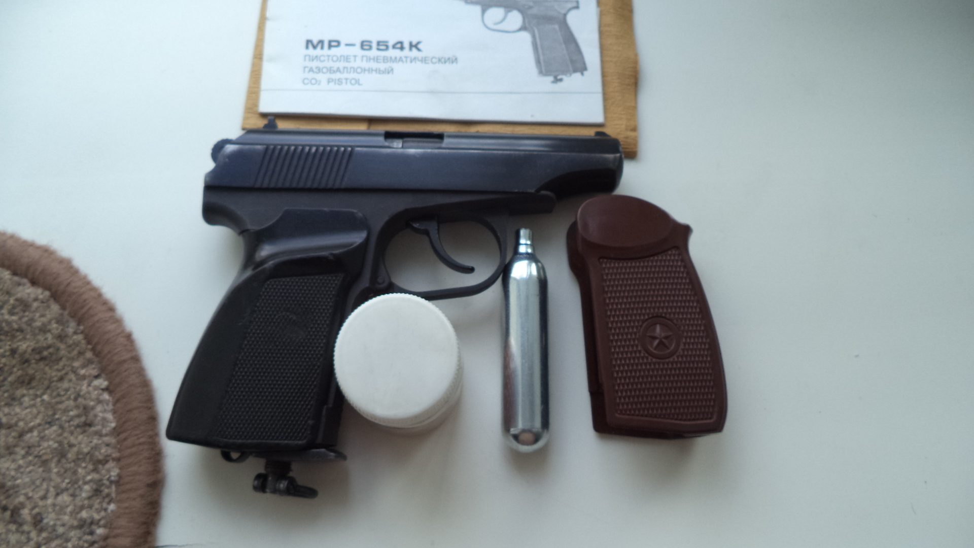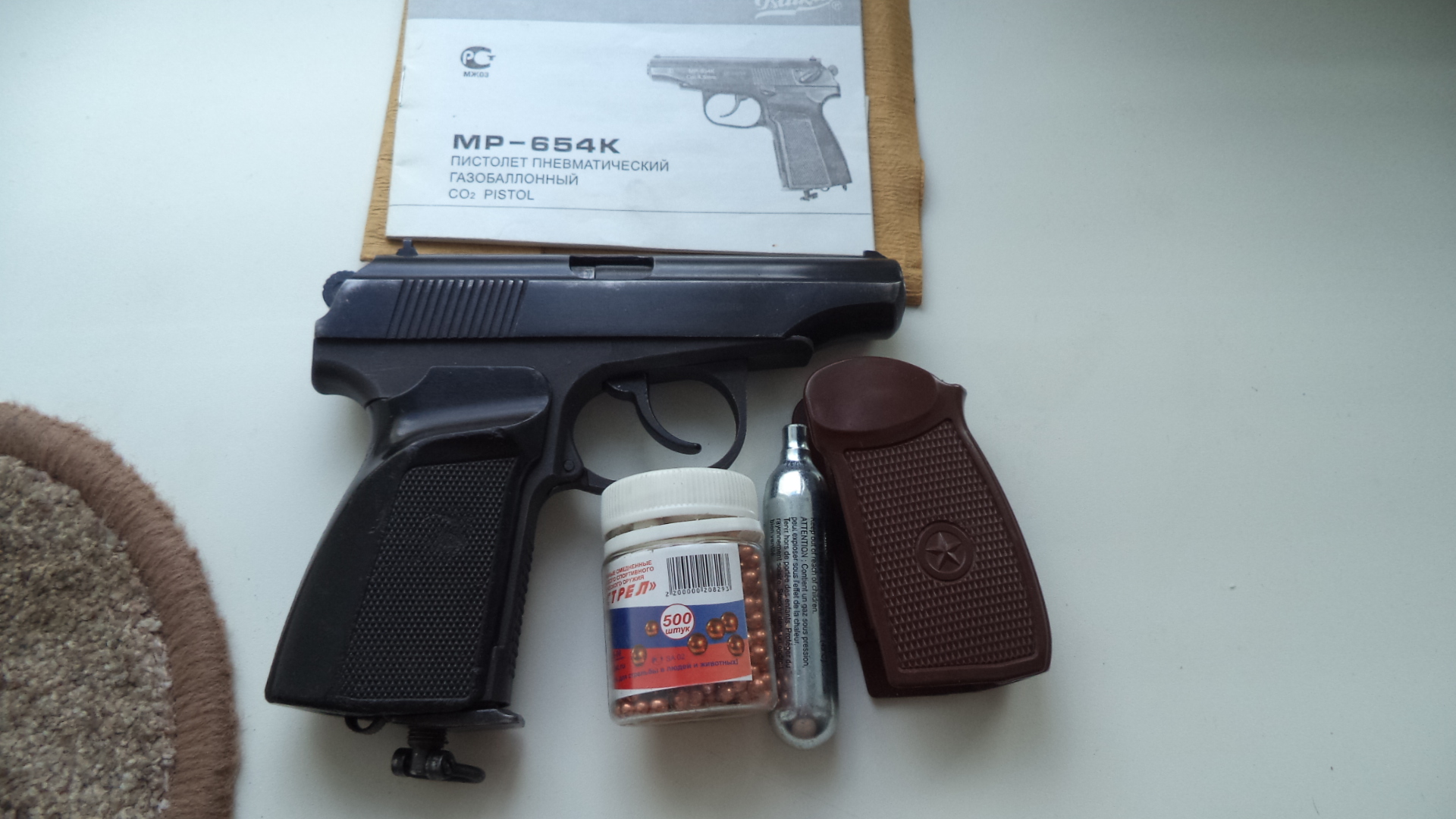 654 в хорошем состоянии. Две рукоятки пластиковые.Баллон . Шарики.В магазине сделан центровочный болт для шаров, и насечки . 180 рублей. Вышлю. 80336863322.