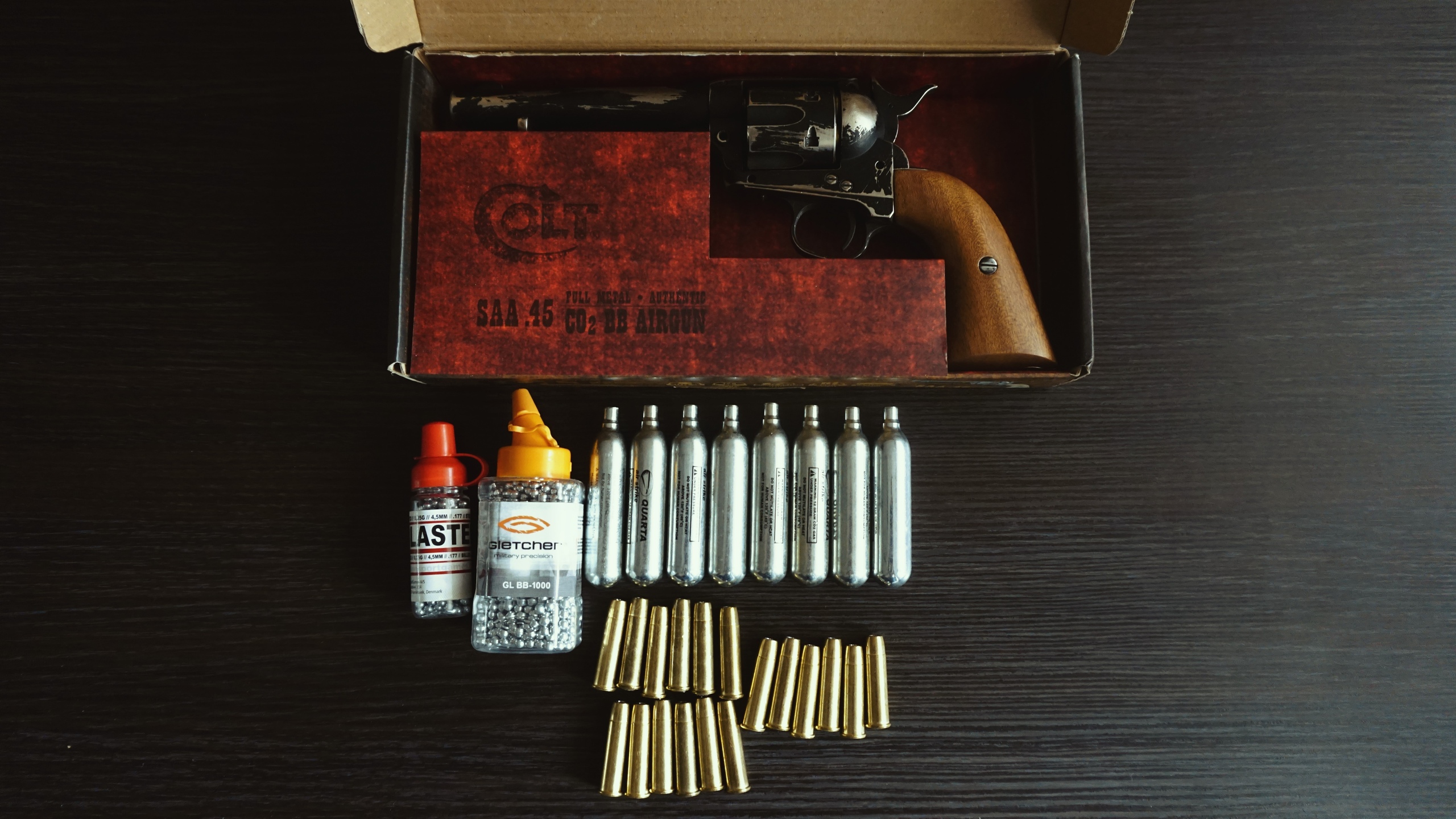 Покрашен и застарен, пластиковые накладки на рукоять заменены на лакированное дерево, сделанное на заказ. Докуплены гильзы, теперь в общей сумме их 24. Состояние - был один раз на улице, потом радовал глаза дома. Лежит в коробке без дела.