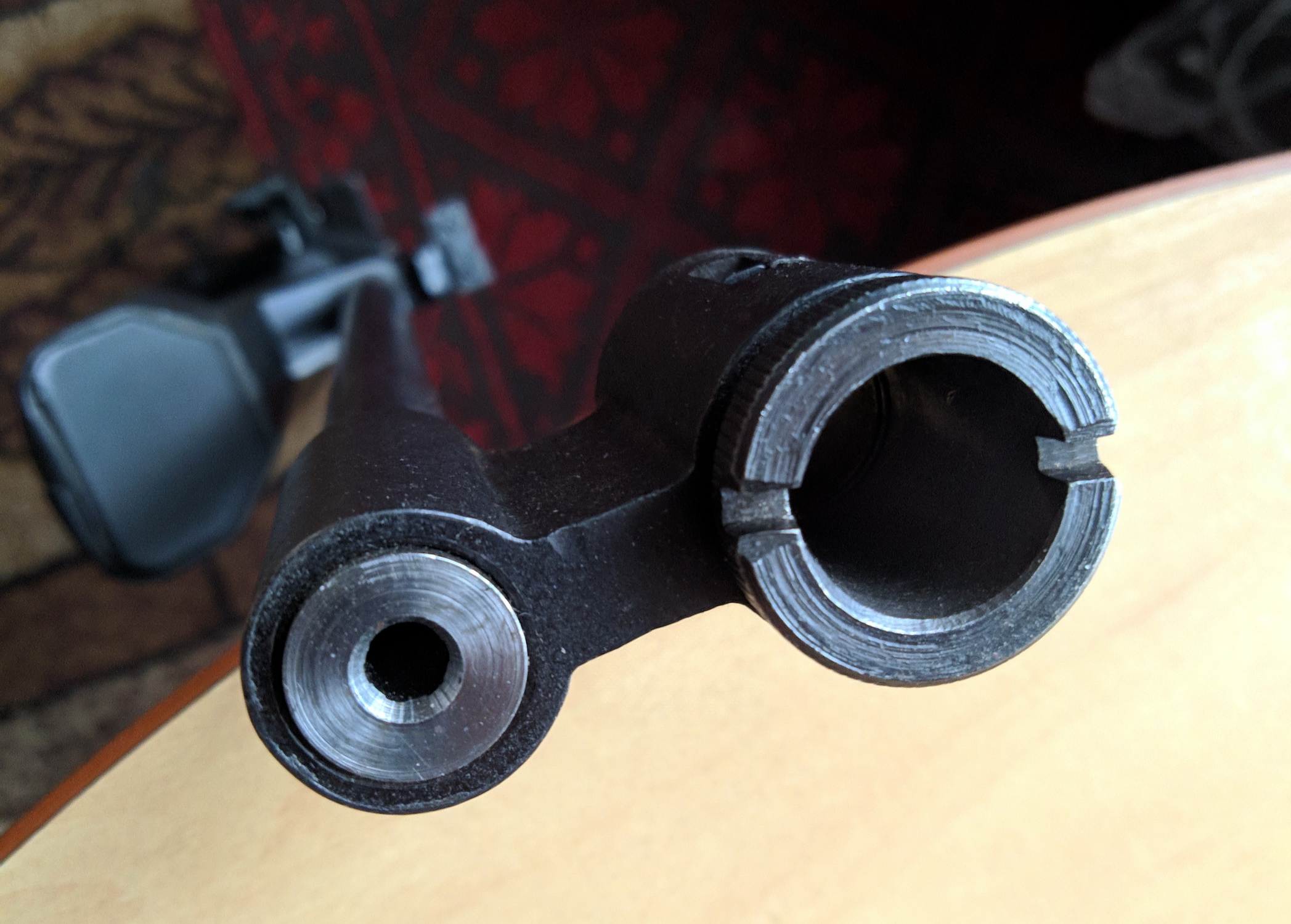 Сергей про то "технологическое" отверстие в ствольной коробке высверленное владельцем для извлечения штифта фиксирующего ствол,перед проёмом для установки магазина.