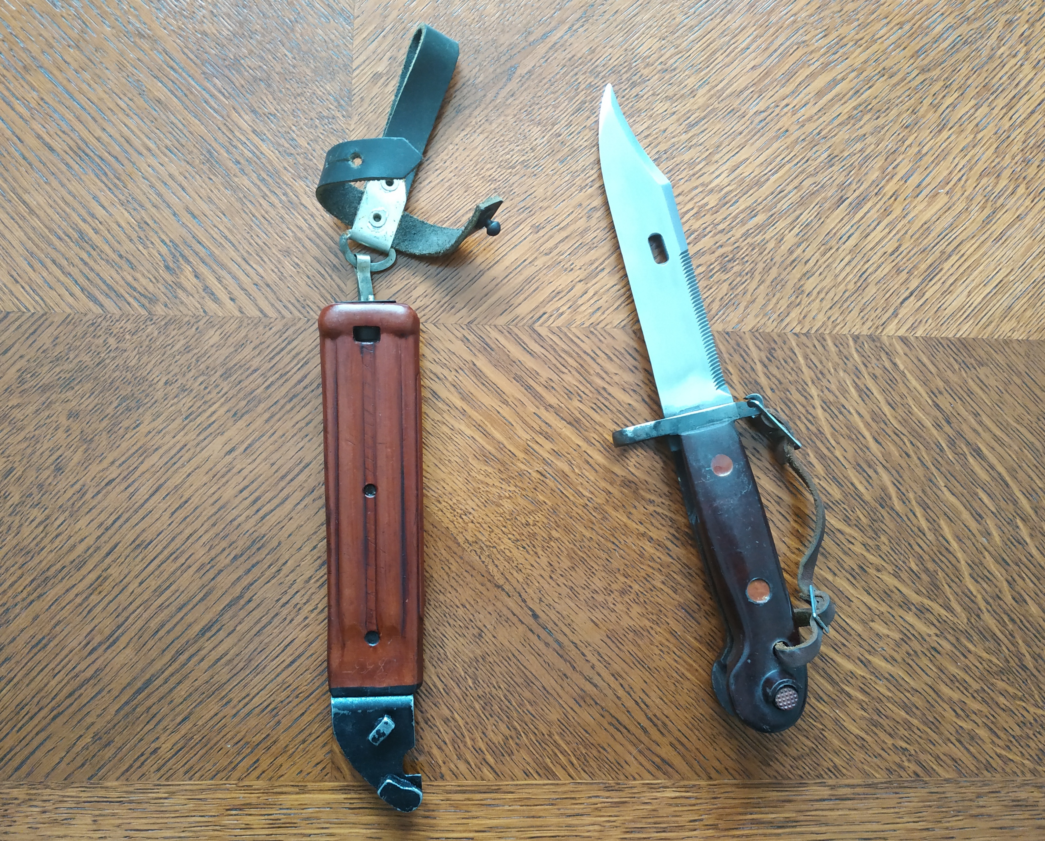 Модель ШНС-001-02 (переходной между АКМ и АК74), цельная коричневая рукоять бакелит, бакелитовые ножны, без пропила.