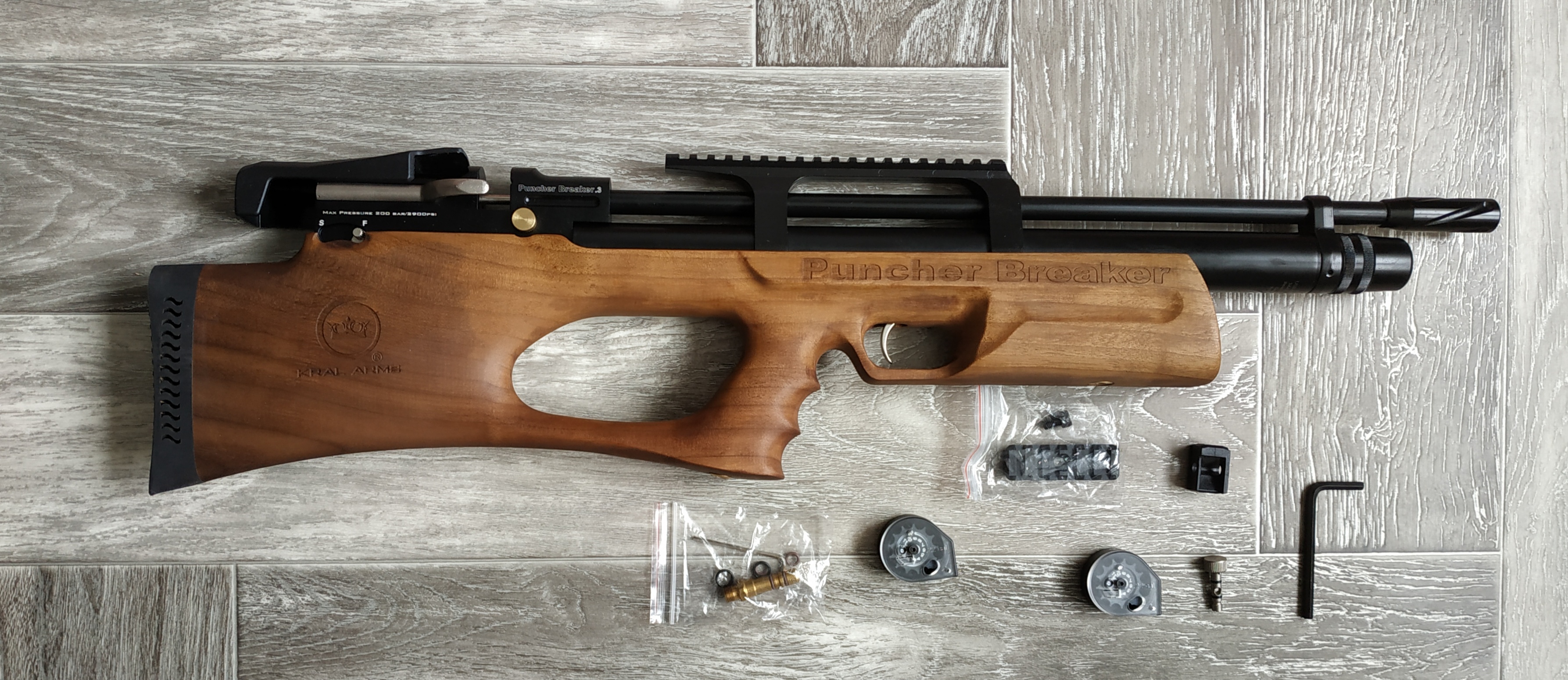 Комплектация: винтовка, магазин-барабан - 2 шт., заправочный штуцер, перепускной клапан, планка Вивер, ЗИП, паспорт (инструкция)