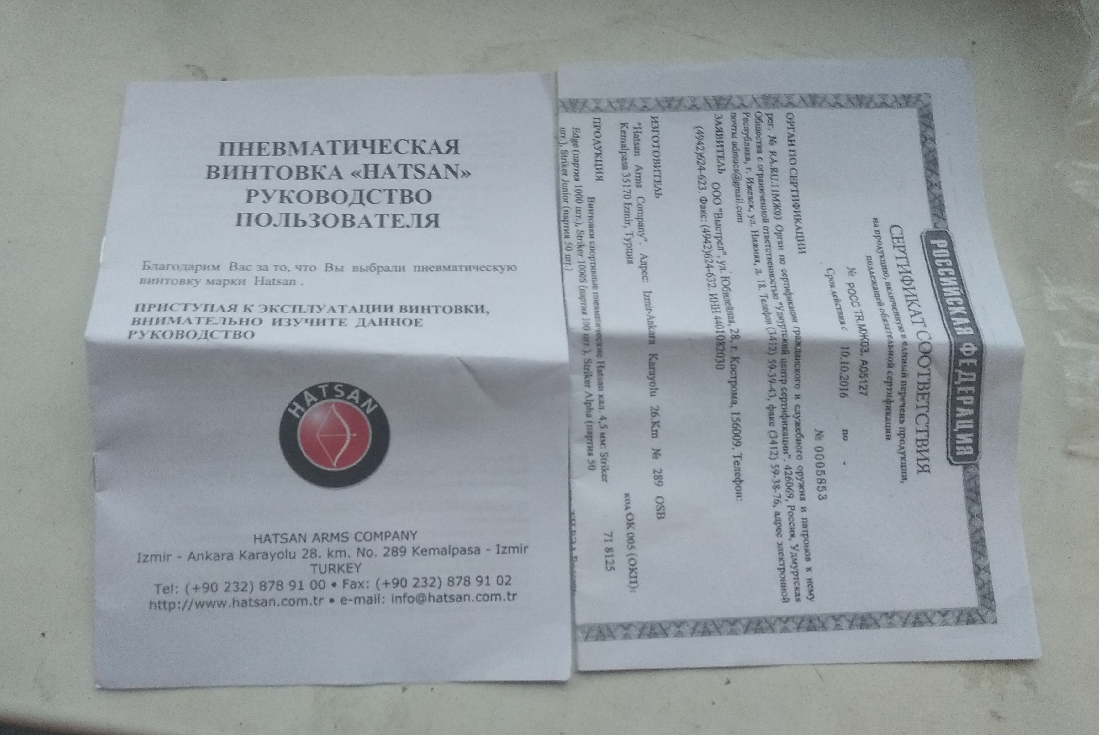 Комплект: винт. Чехол (шил под hatsan 90. Немного длинноват но не критично. Паралон в плотной ткани на липучках. Очень удобный)
