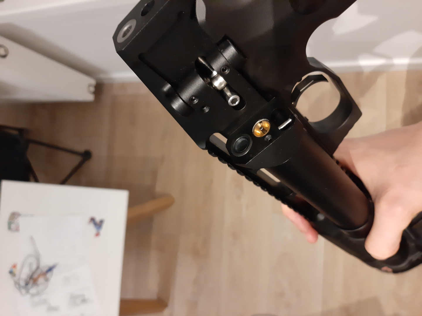 Спусковой механизм доработан с помощью изменения формы сопрягающихся поверхностей ( т.е. не с помощью винтов с пружинкой), в итоге возвращающийся в середине хода спуск, небольшое нарастание усилия перед срывом шептала, повысилась его безопасность и надежность.