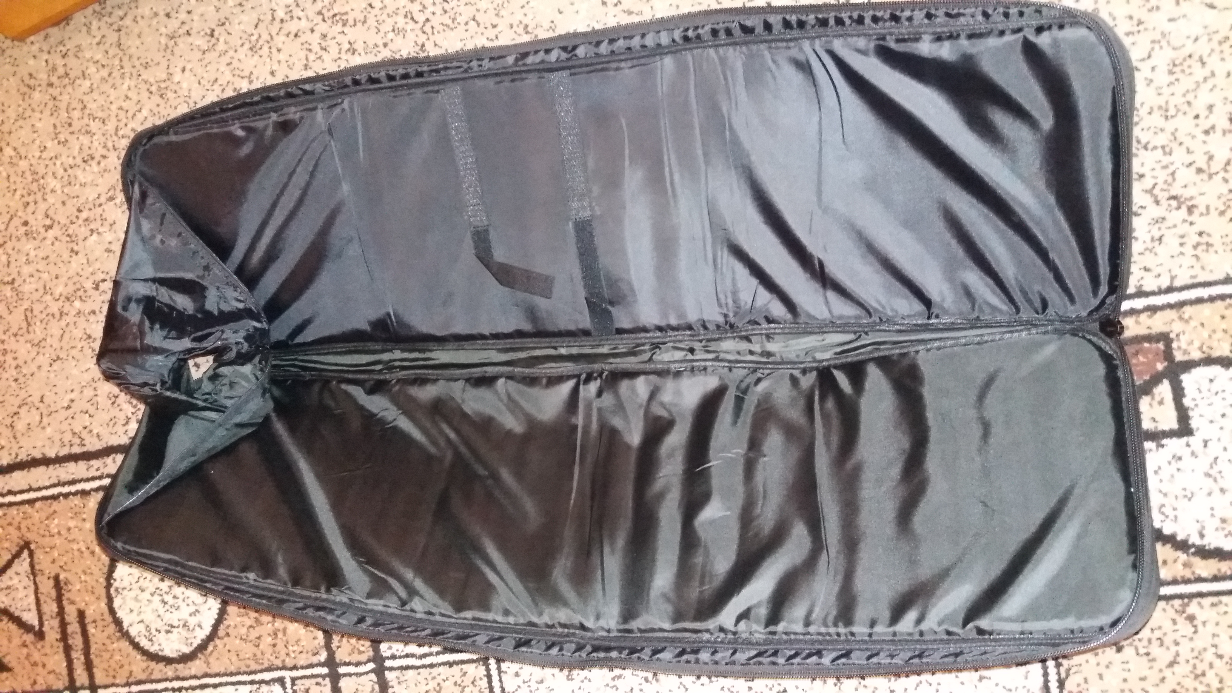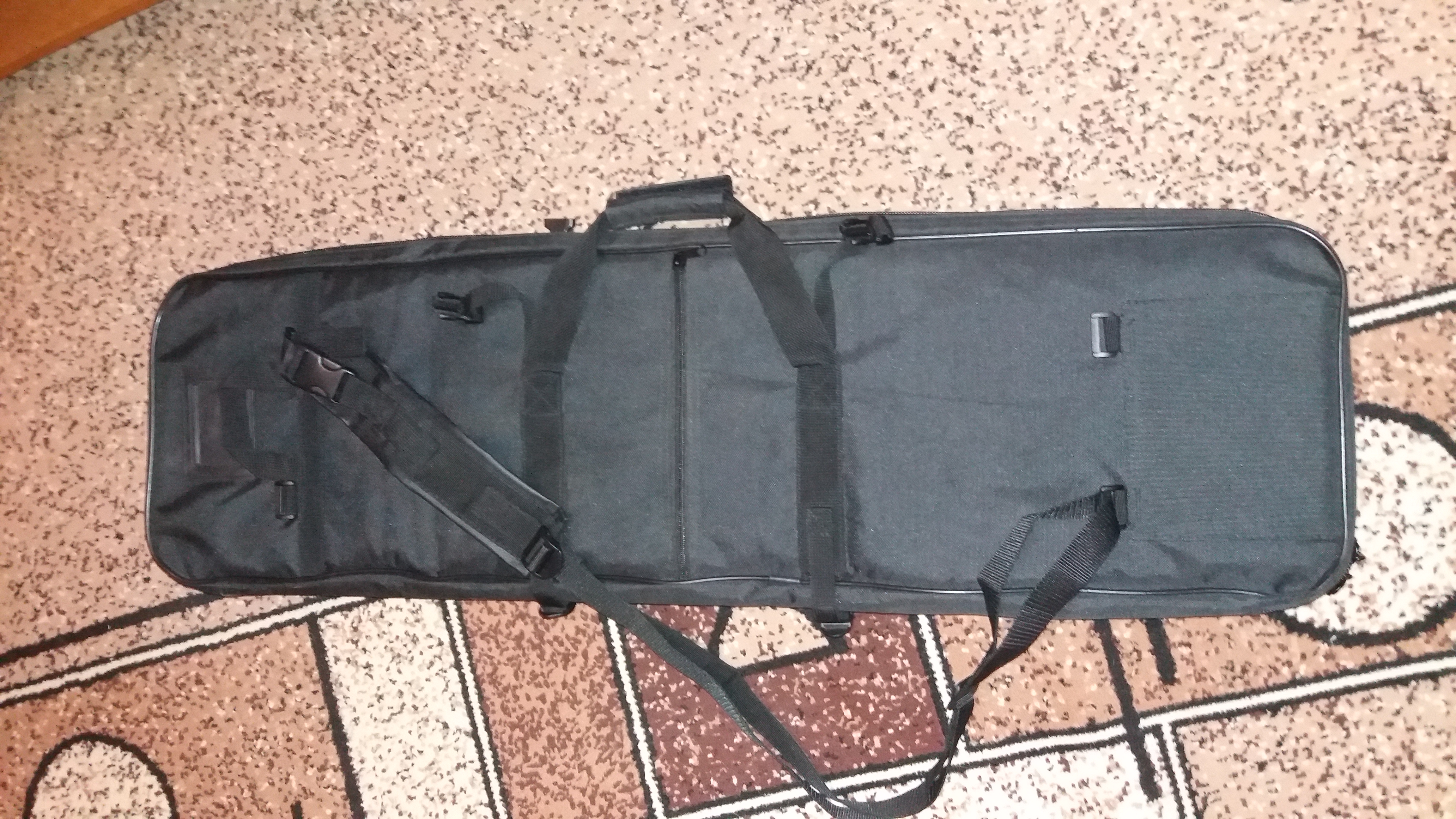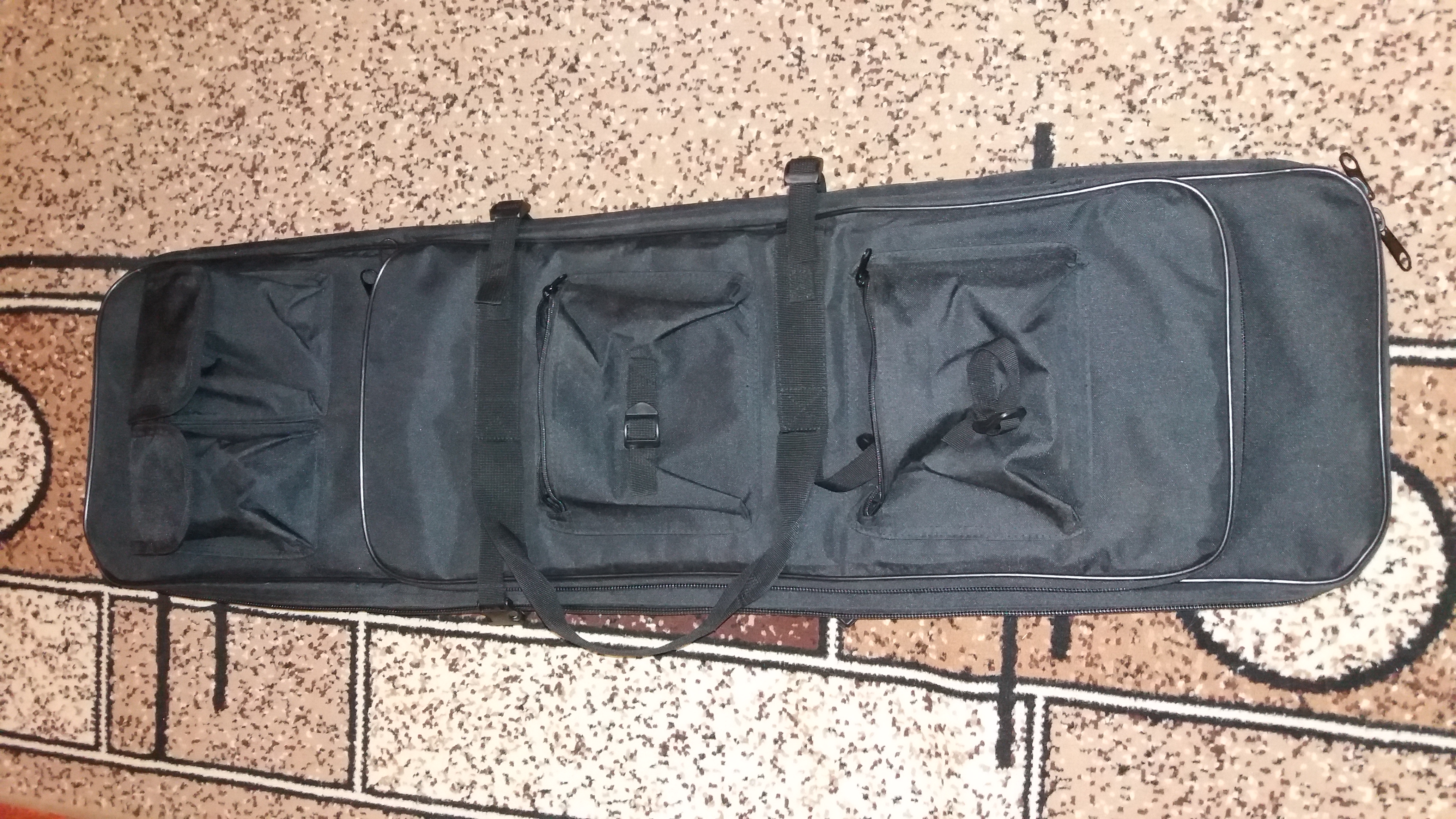 С поролоном, есть нормальный ремень для переноски через плечё. Длина около 100см +/-. Цена на данный момент 65р.