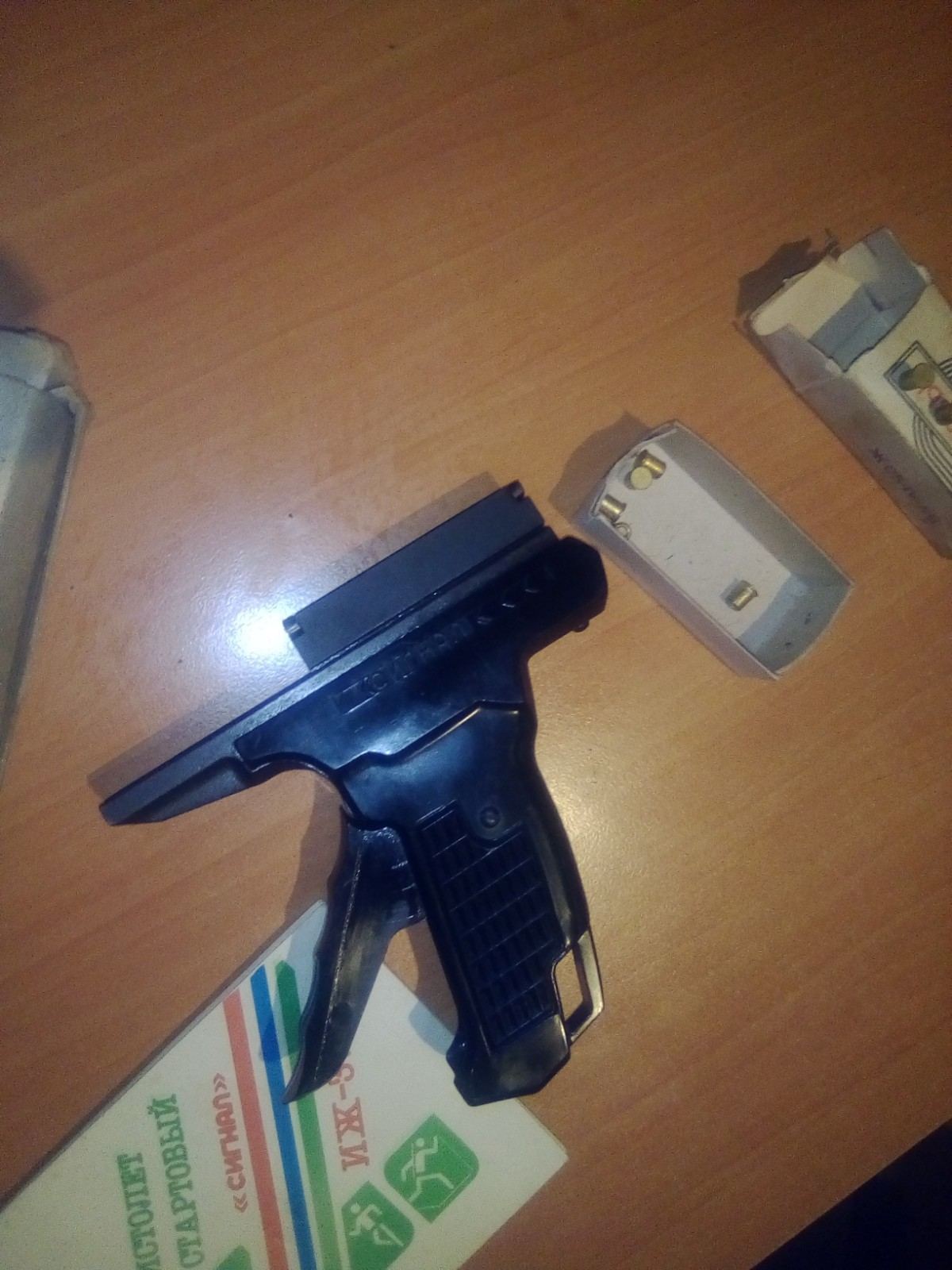 Универсальный 9-ти зарядный советский стартовый пистолет с возможностью стрельбы как капсюлями, так и шумовыми кольцевого воспламенения (просто обойма вставляется другим концом).