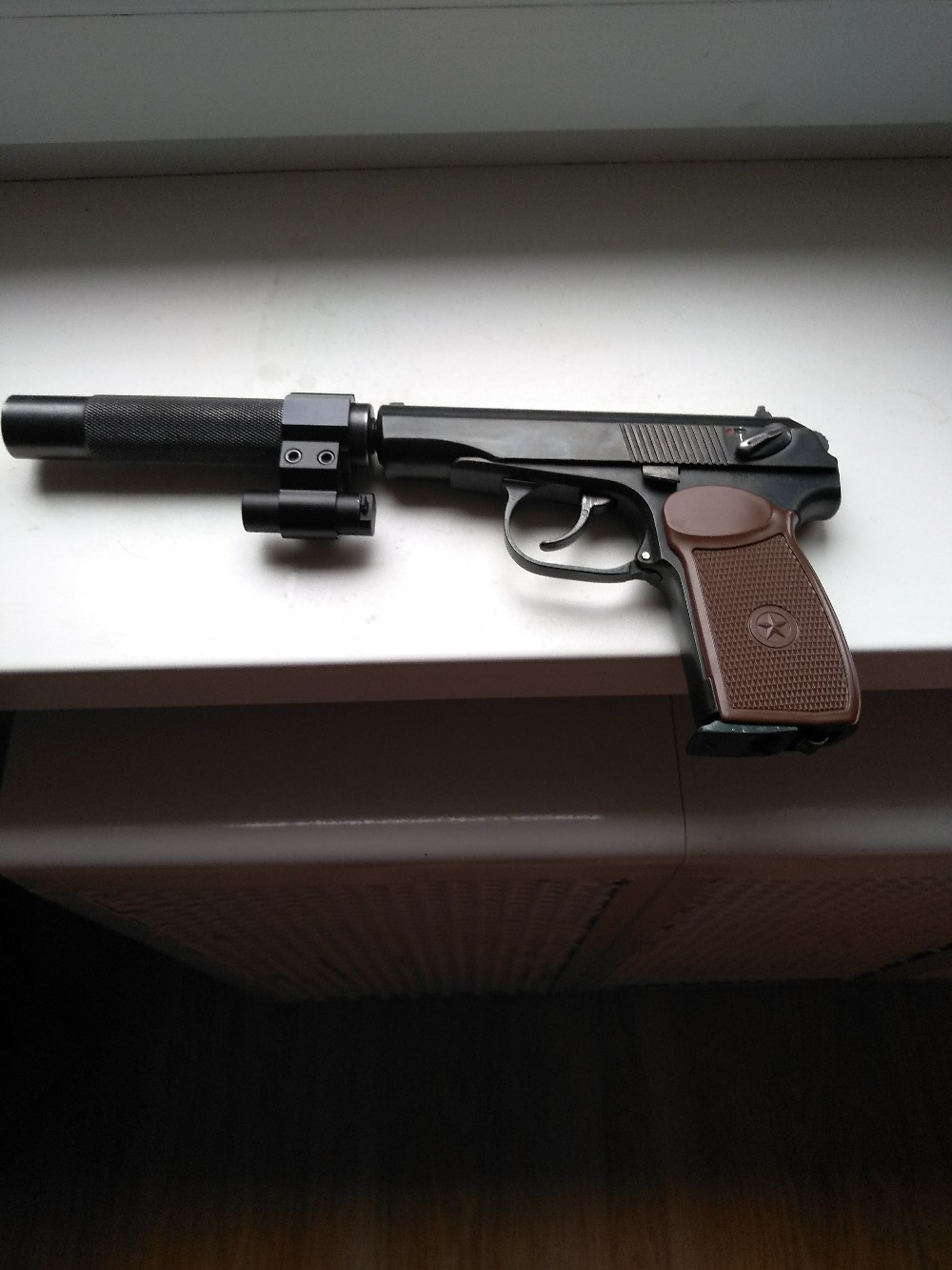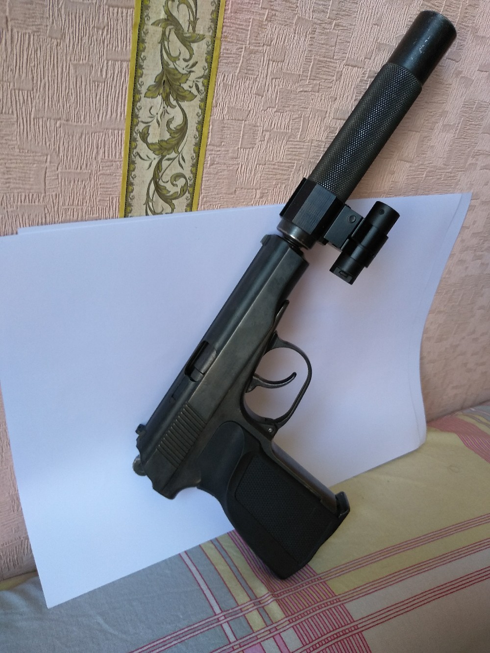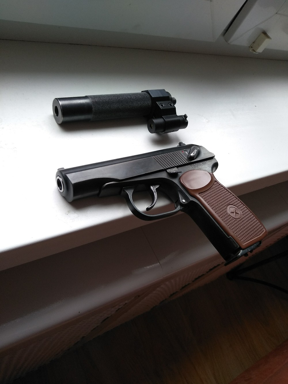 По внешке, установлен имитатор выбрасывателя,шлифован,переворонен,рукоять со звездой.По нутру - гладкий стволик с удлинителем,прокладка ствола вадо,гайка круглая под прокладку, удлиненный ударник,голова магазина с винтом регулировки.На фальшглушителем стоит планка с лцу.Скорость на фото.Цена за комплект -350 руб.Тел+375295596721.