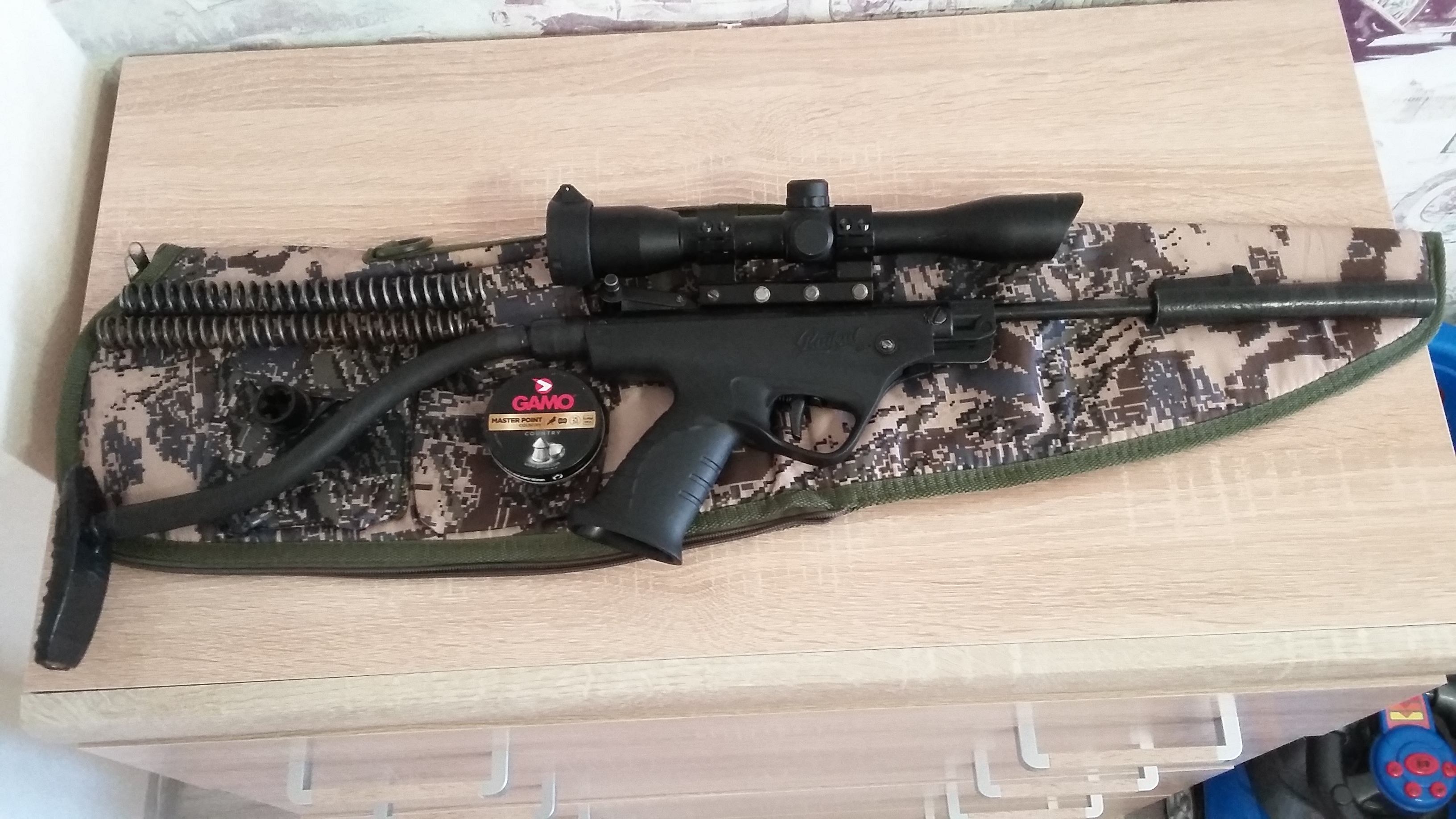 Установлена гп,в комлекте родная пружина+усиленная,родной задник,оп китай,чехол,остатки пуль ,костыль быстро откручивается,пересыл есть,цена 130р,тел.8295164